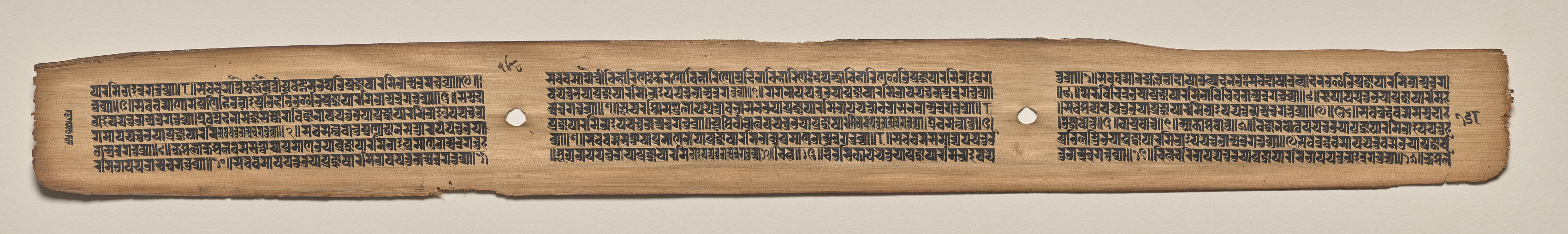 Long, narrow, tan-colored manuscript page with rough, uneven edges, featuring three columns of black text written in a small, uniform script. Two small holes are present, one near the center and another to the right, both appearing to be circular and likely used for binding. The text consists of numerous lines of writing, each line containing multiple words. The background behind the manuscript is a solid, light beige color.