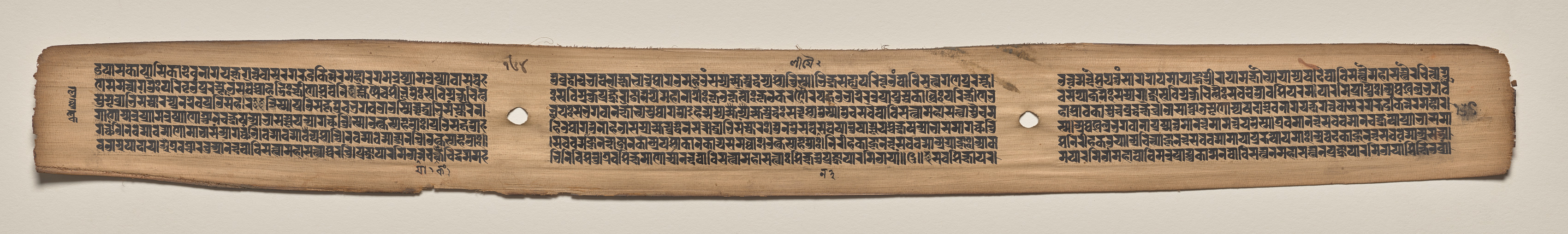 Rectangular, aged, light-brown piece of parchment with rough edges and two holes. The parchment contains black, written text arranged in numerous horizontal lines. The text lines are organized into three distinct sections separated by the holes. The parchment has a darker brown color on the edges and a lighter color in the center. The background behind the parchment is light gray.