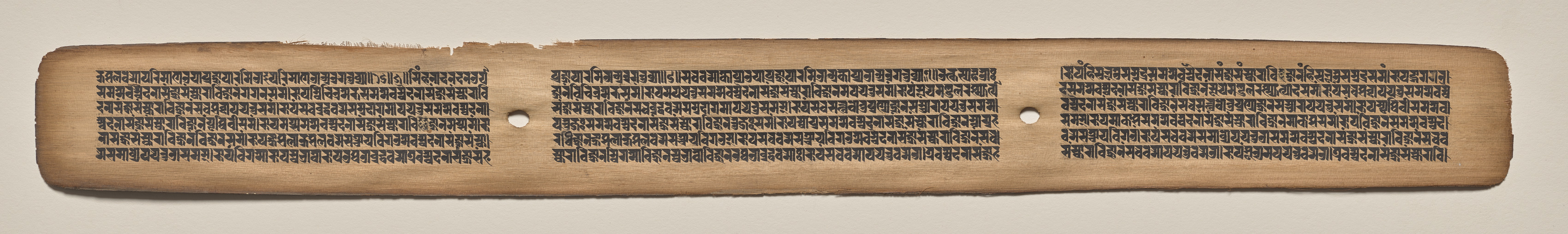 Rectangular, aged parchment or paper with rounded edges, light brown in color. Three sections of text with two holes, one in the middle and one to the right. Text written in black ink, small in size, arranged in lines. The lines are organized into blocks, with approximately 11-12 lines per block. The text blocks are separated by spaces. The background is light gray.