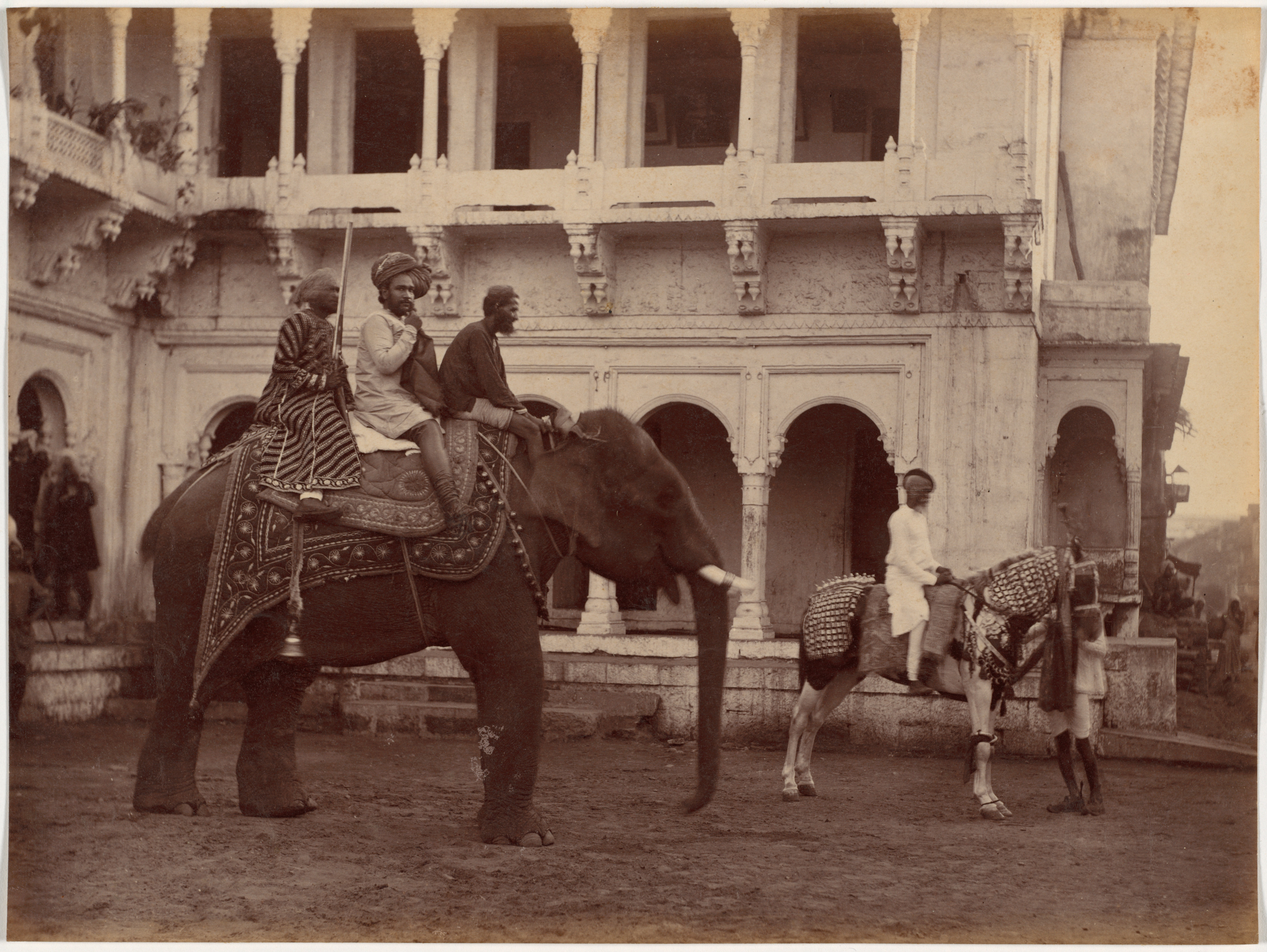 Black and white photo of a large elephant decorated with a saddle. Three men sit on the elephant's back wearing traditional South Asian clothing including turbans. The man in the middle holds a stick. A donkey with a textured saddle and a man on its back are on the right. There are several archways on the building behind.