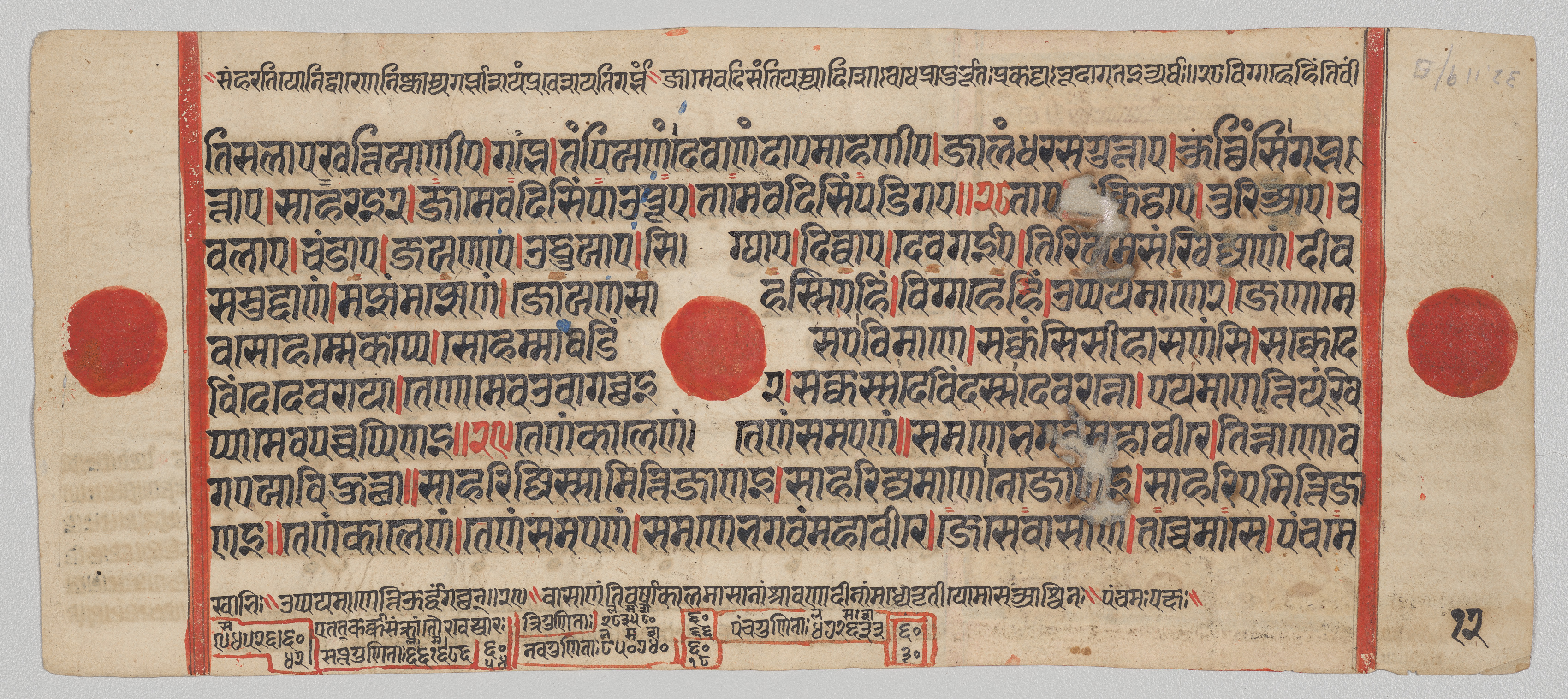 Beige-colored page with black, red, and blue text written in an ancient Indian script. Two red vertical lines run along the left and right edges. Three red circles, two large and one small, are placed along the center and bottom of the page. Small black symbols are at the bottom right corner and near the top edge. The text is arranged in lines across the page.