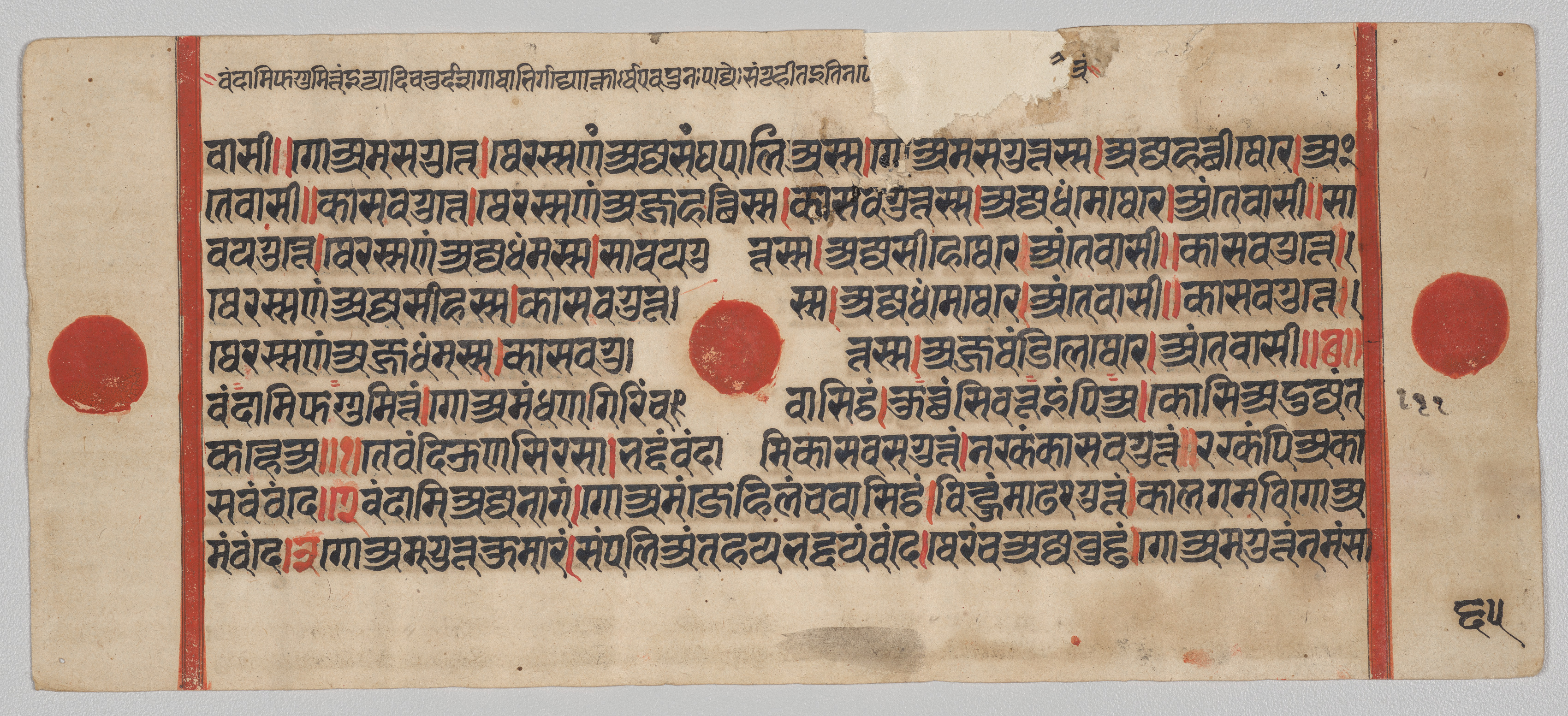 A Kalpa-sutra manuscript page with a light-brown background, displaying black text written in a non-Latin script, likely Sanskrit, with two red vertical lines on the left and right sides, and three red circular marks.