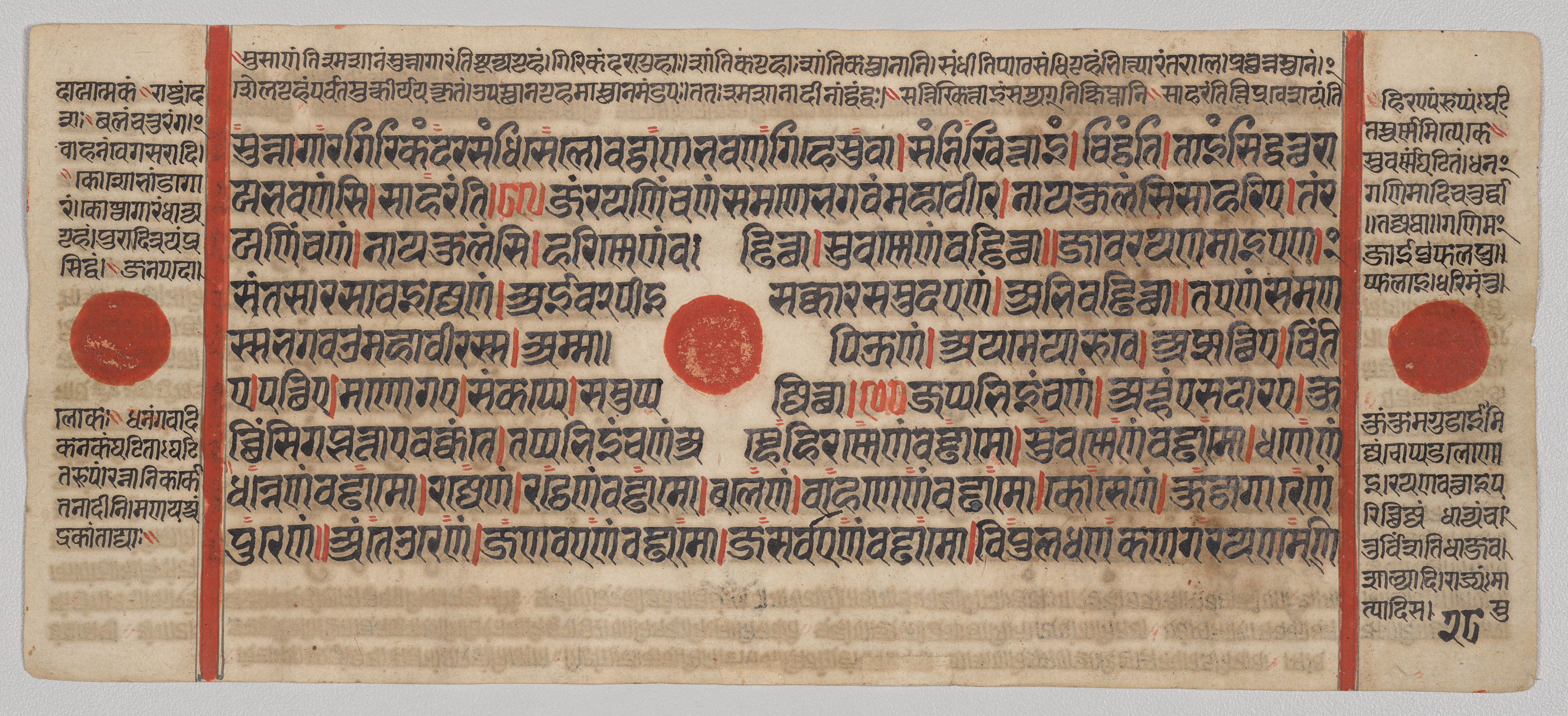 A long, rectangular piece of aged paper with text written in black ink and a few red circular decorations. The paper is light beige with darker edges and a few darker spots. Three vertical red stripes run down the page on the left, middle and right. The left and right stripes are thin while the middle stripe is wider. Three red circles, one on either side and one in the center, are on the page. The text on the paper is written in a language that appears to be Sanskrit or another ancient Indian language. The text is written in a flowing script with intricate lettering. The background behind the paper is plain and light gray.