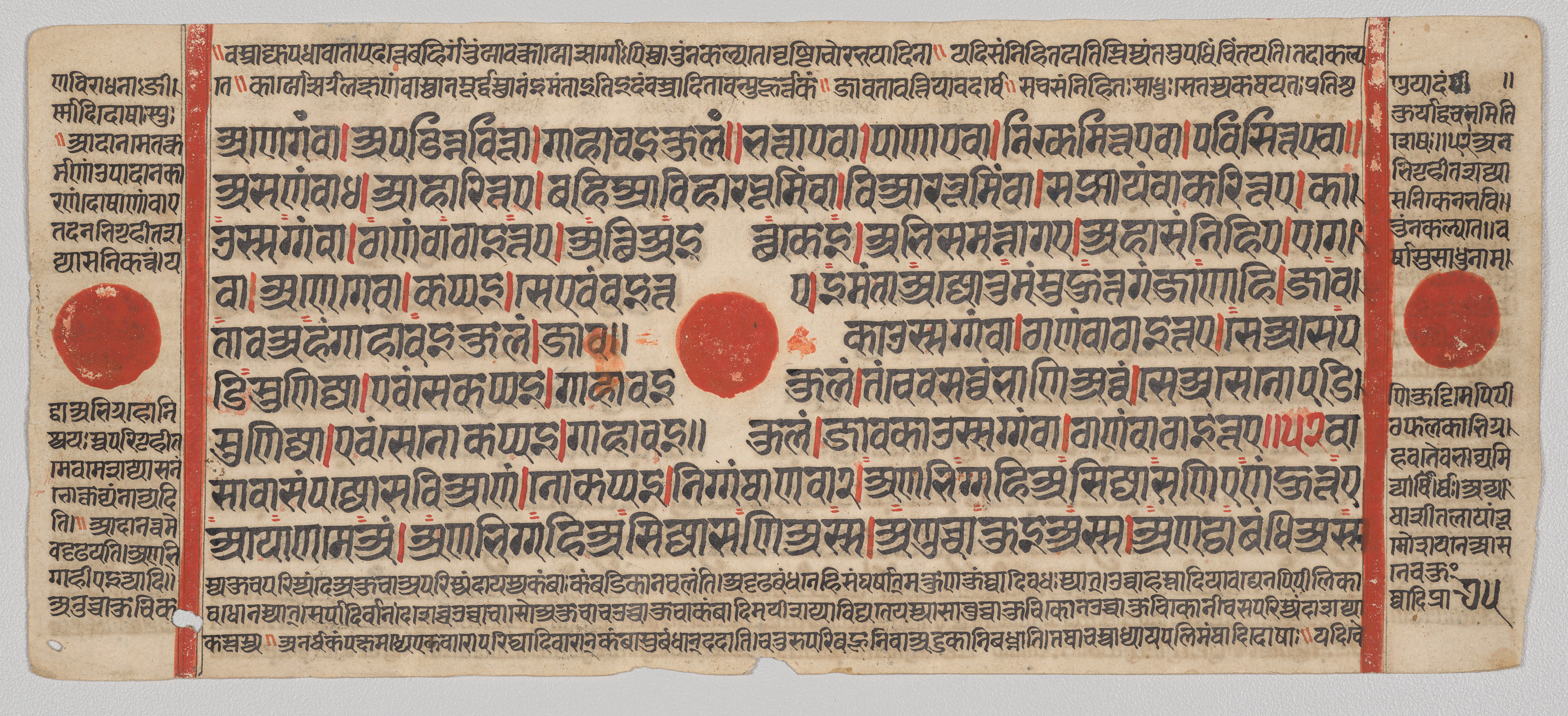 Yellowed rectangular paper with uneven edges and holes along the left and right sides. Red vertical lines run along the left and right sides. Three red circles, one on the left side, one in the middle and one on the right side. Black and red text written in a foreign language. The text is arranged in lines that run horizontally across the page. The paper appears aged and worn.