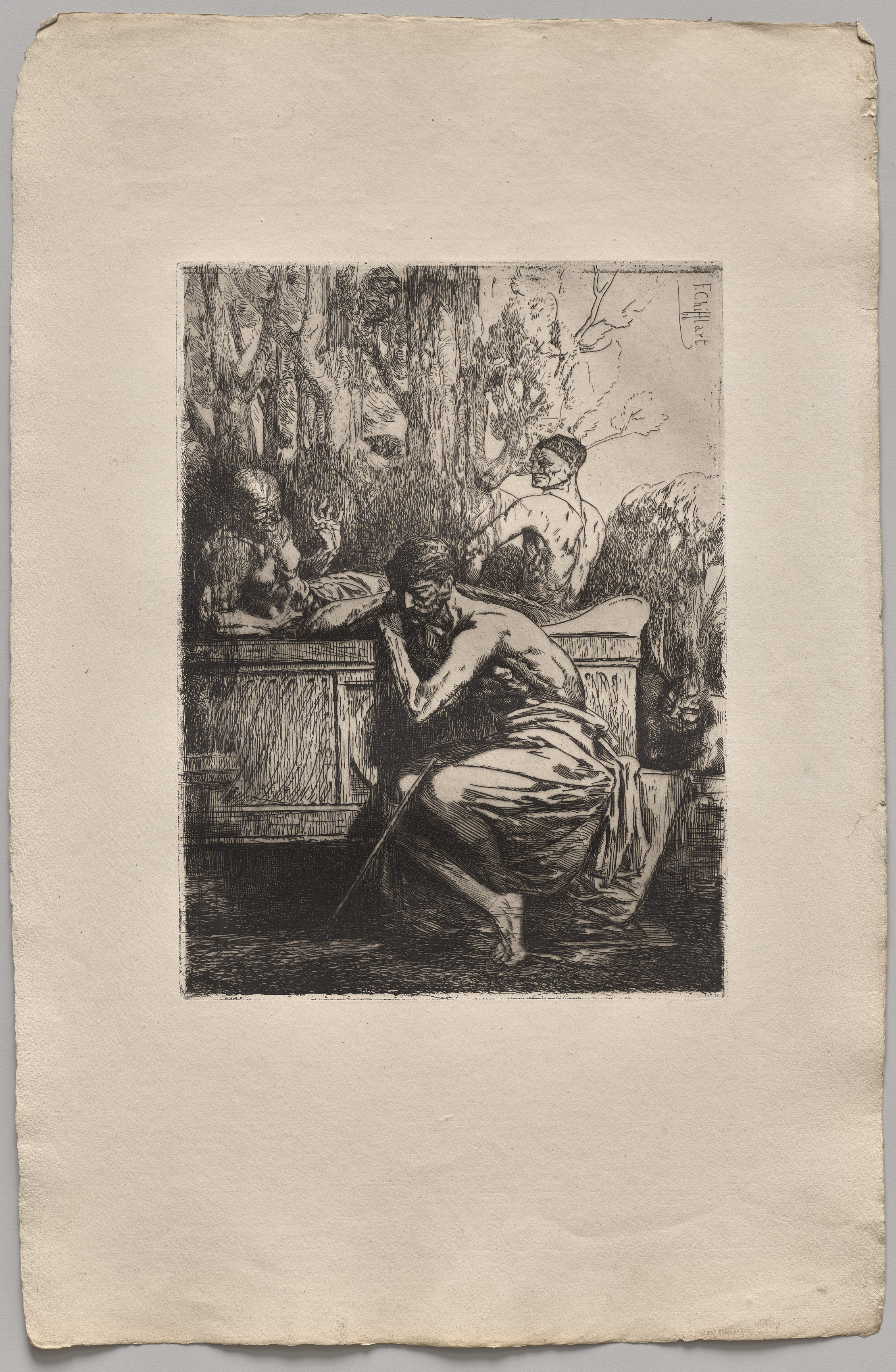 Black and white drawing on off-white paper of a man bent over and kneeling on one knee, head down. He is wearing a cloth hanging down from one shoulder and tied around his waist. His arms are wrapped around his head and one leg is bent behind him. He appears to be leaning on an object resembling a large box with panels on the side. The man and the box are in front of a tree with other figures on the left on or near the tree and one figure on the right sitting on the box. The drawing is titled Meditation and created by Nicolas-François Chifflart.