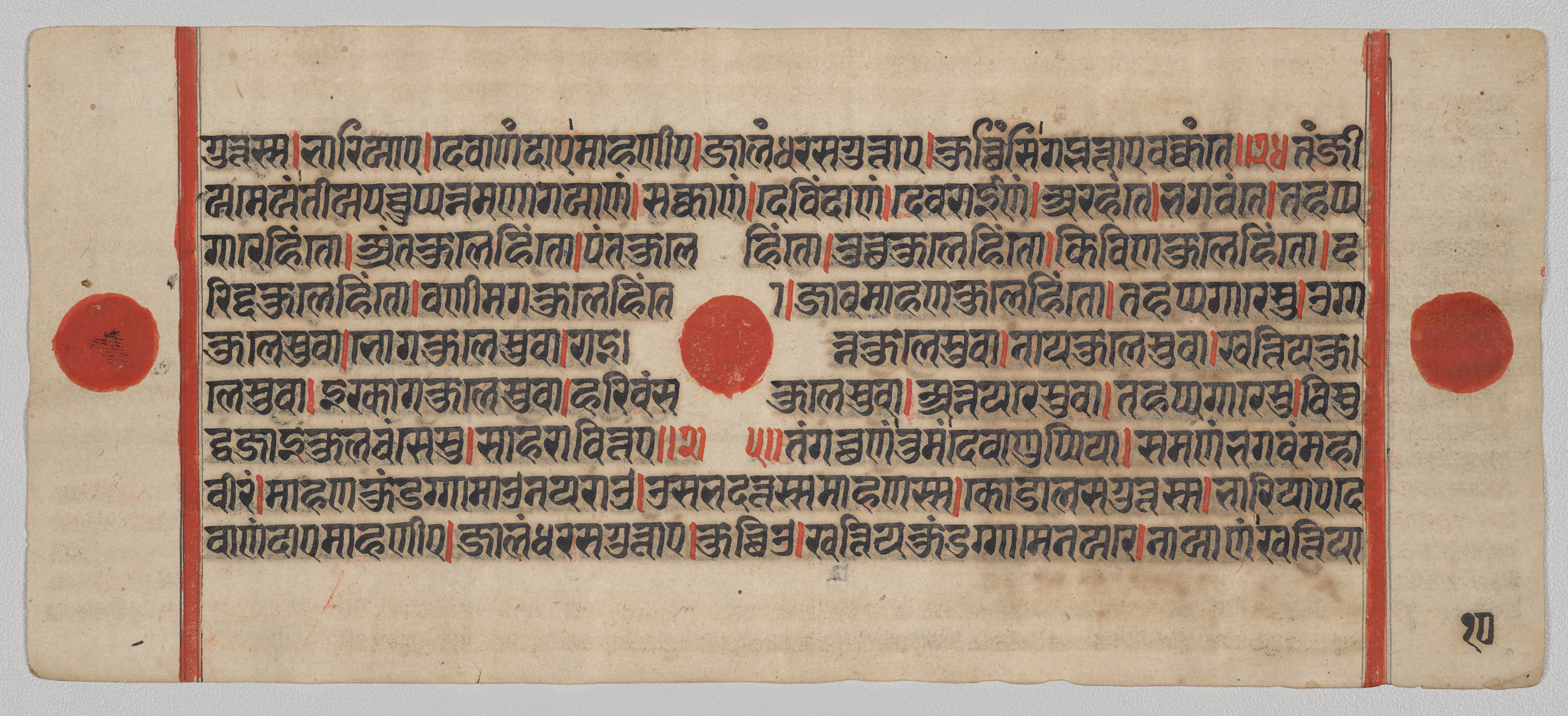 A rectangular piece of aged paper with rough edges and a light brown color; two vertical red lines run along the left and right edges; three red circles of varying sizes are present, one on the left edge, one in the center, and one on the right edge; black and red handwritten text in an ancient language, possibly Sanskrit, covers most of the surface; a small black symbol is in the bottom-right corner.