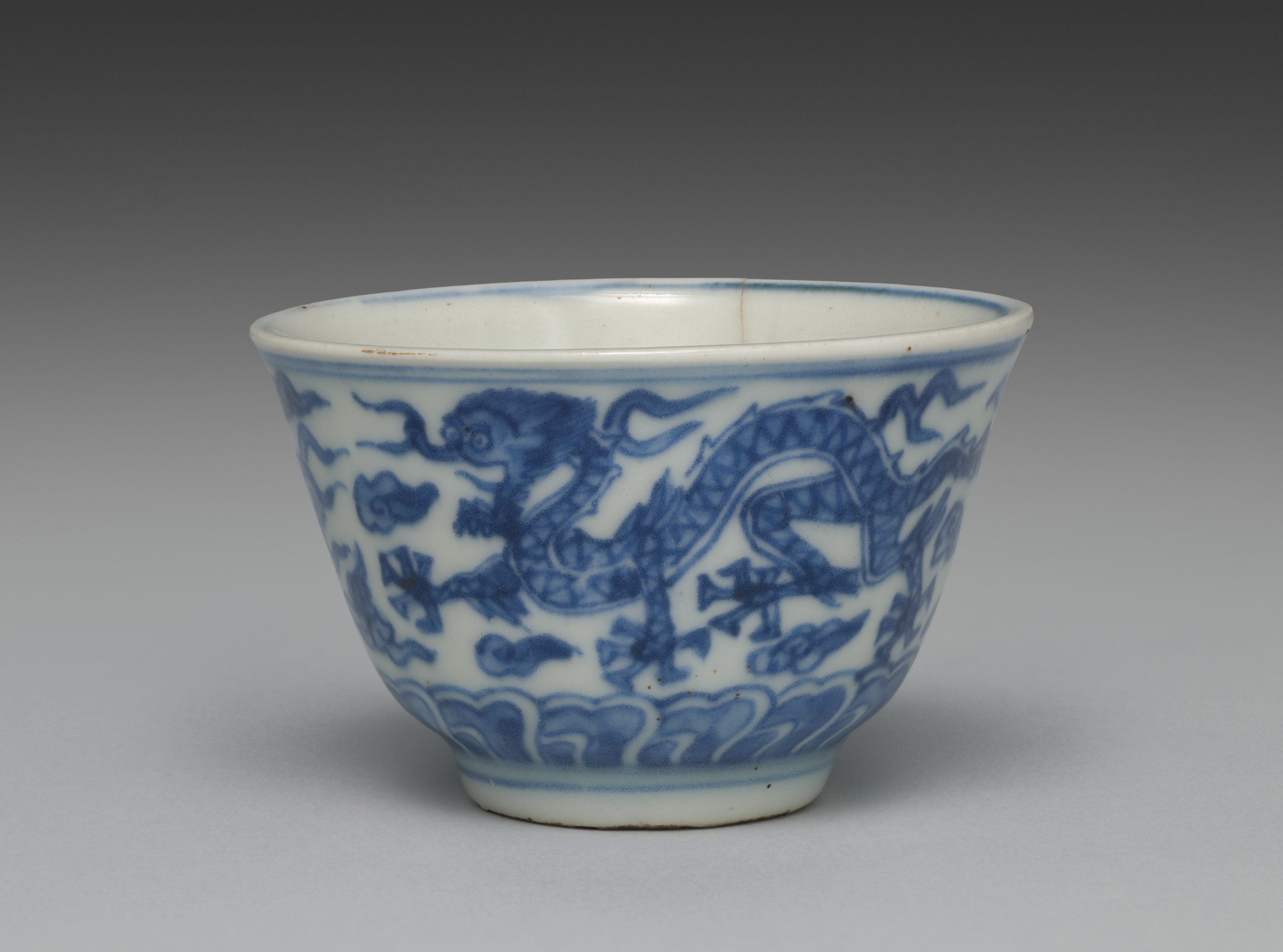 White porcelain cup with a wide mouth and a narrow base. Exterior features blue and white design depicting a dragon. The dragon design encircles the cup, with the dragon's body stretching across the side. The dragon has a long tail and appears to be surrounded by stylized clouds or waves. A blue line runs along the rim and base of the cup. Background of the image is gray, with the cup casting a shadow on the surface below.