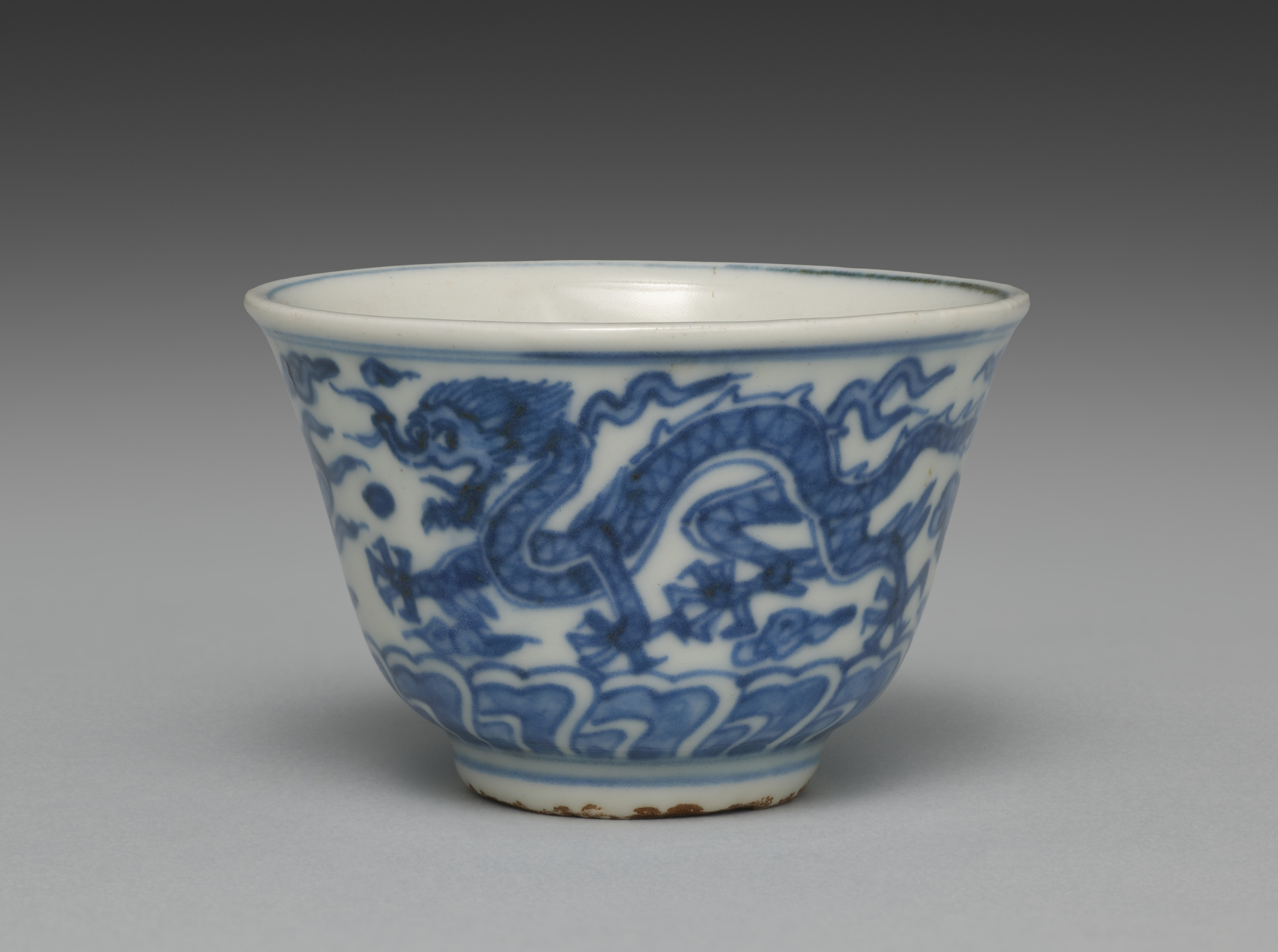 White porcelain cup with blue designs, slightly flared lip and a short foot. A dragon and clouds are depicted in blue on the exterior. The dragon has a long body with scales and appears to be surrounded by stylized cloud motifs. The interior is white. A thin blue line encircles the rim. The background of the image transitions from dark grey at the top to light grey at the bottom.