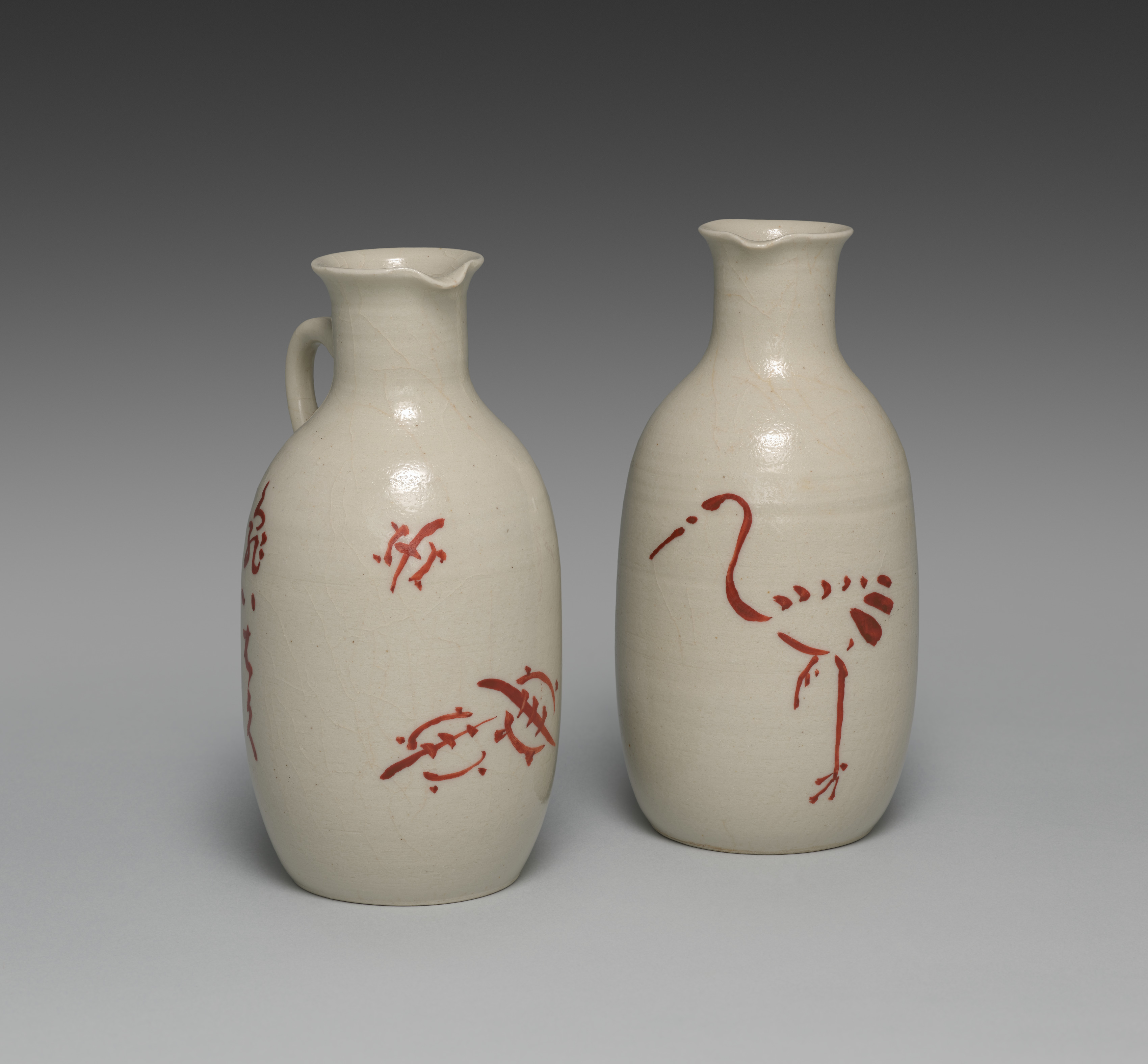Two white ceramic jugs with red designs. The jug on the left has a handle on the left side, a spout on the right side, and three red designs. The designs on the left jug are on the front and right. The jug on the right has no handle and one red design of a bird on the front. Both jugs have a glossy finish and are roughly the same size and shape, with a wide body and narrow neck. The background is a gradient from dark gray at the top to light gray at the bottom.