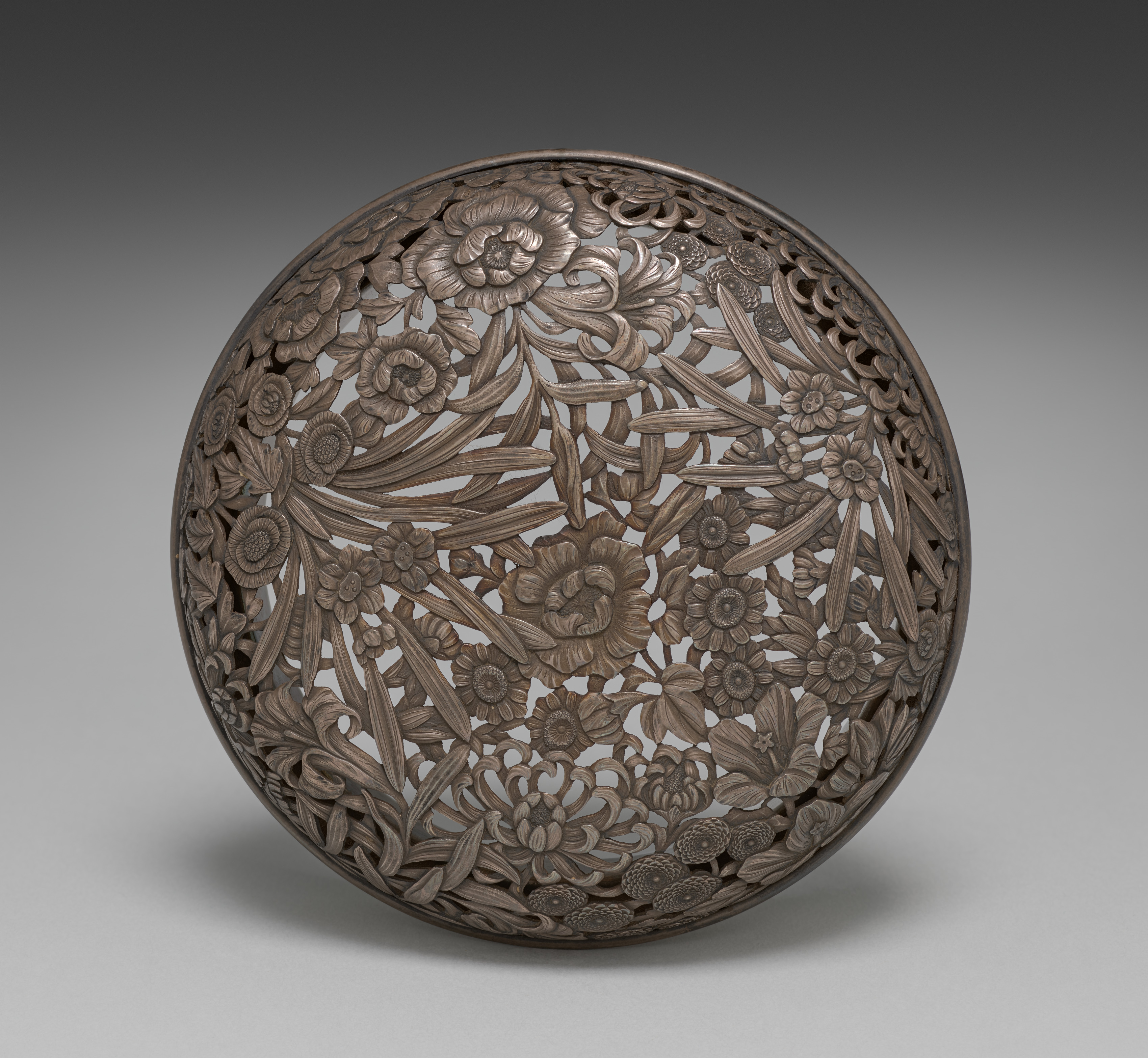 Round lid with a flat top, featuring an intricate floral pattern carved into it. The lid is made of a dark-colored metal, possibly bronze or silver. The floral pattern includes peonies and other flowers, leaves, and stems. The background is a gradient of dark gray to light gray. The lid appears to be an incense burner lid. Cloud-like shapes are interspersed among the floral pattern.