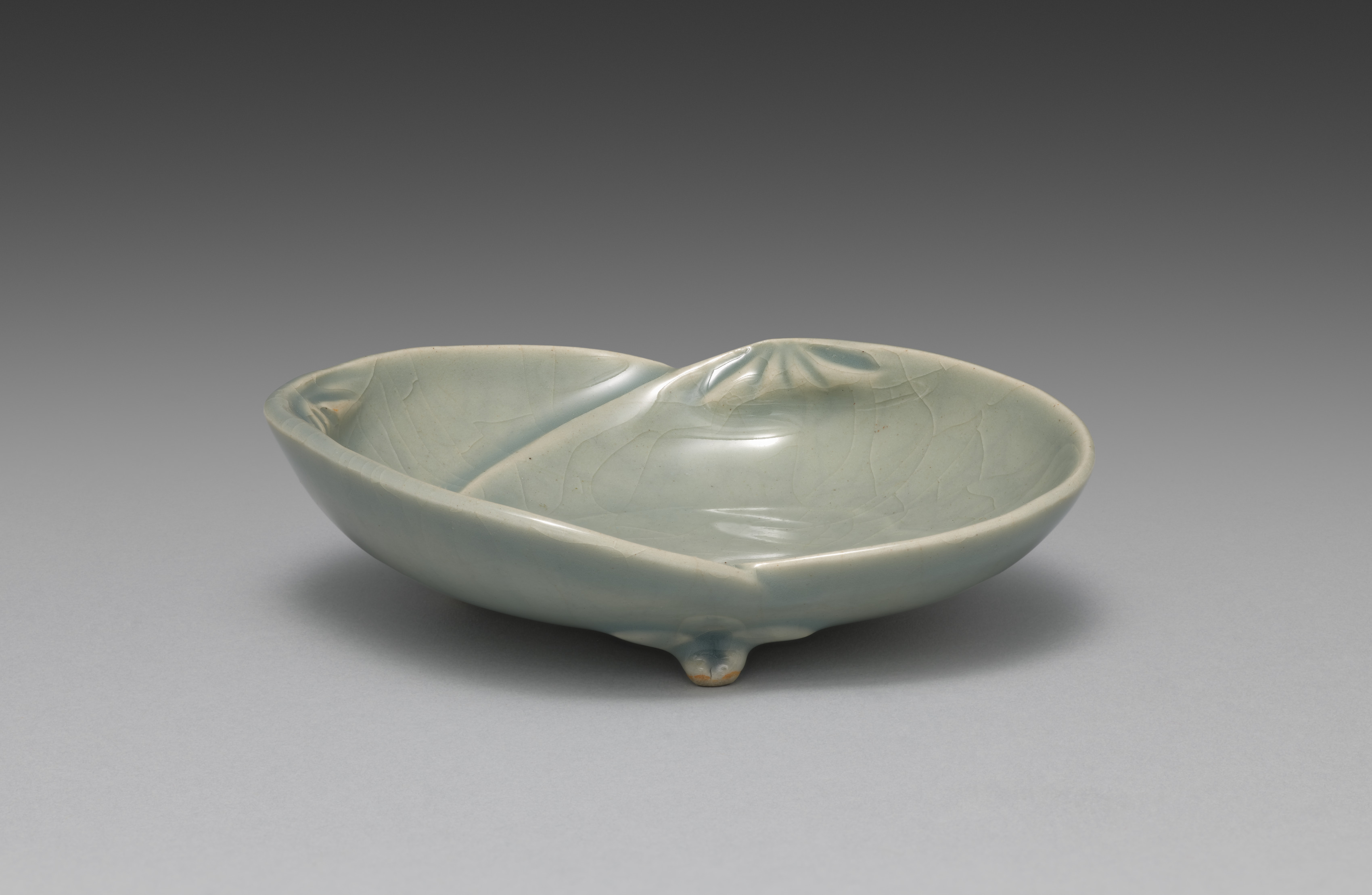 Dish with a pale green glaze, resembling saucers with matching shells, by Seifū Yohei III. The dish is irregularly shaped, resembling a leaf or a shell, with one end featuring a raised section that looks like a shell. It has three small feet at the bottom. The glaze is predominantly pale green with some crackle patterns visible on the surface. The background of the image is a gradient transitioning from dark gray at the top to light gray at the bottom.