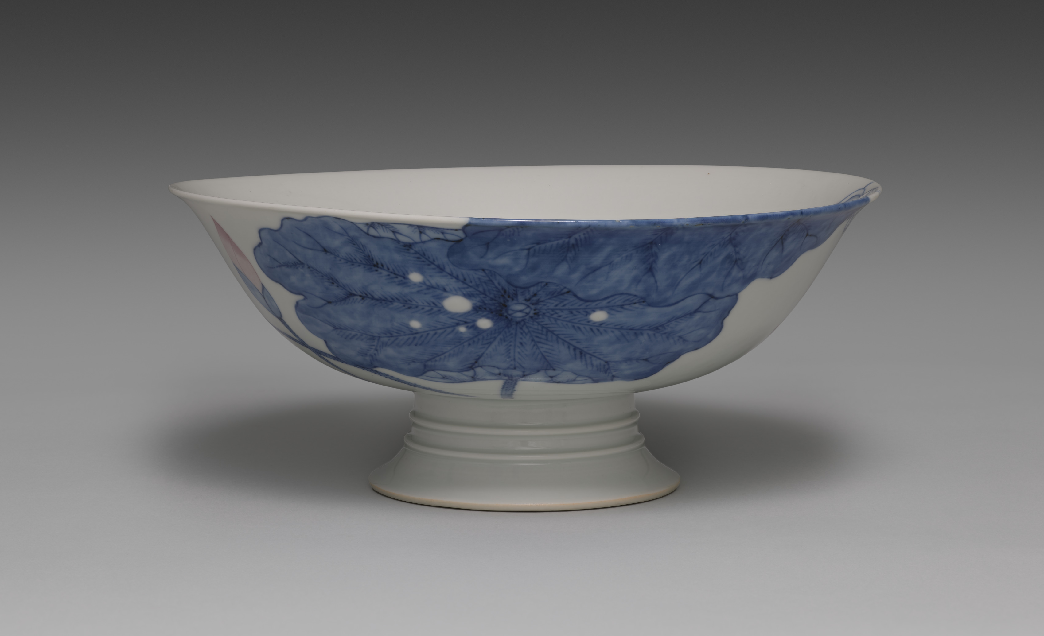 White ceramic bowl on a short, flared foot with three ridges. The body of the bowl is wide and flares out to a rounded rim. A blue and white design depicting a pond scene with lotus flowers and leaves. The blue design covers about one-third of the bowl's exterior surface. The background of the image is a gradient dark gray to light gray, with the bowl casting a shadow.