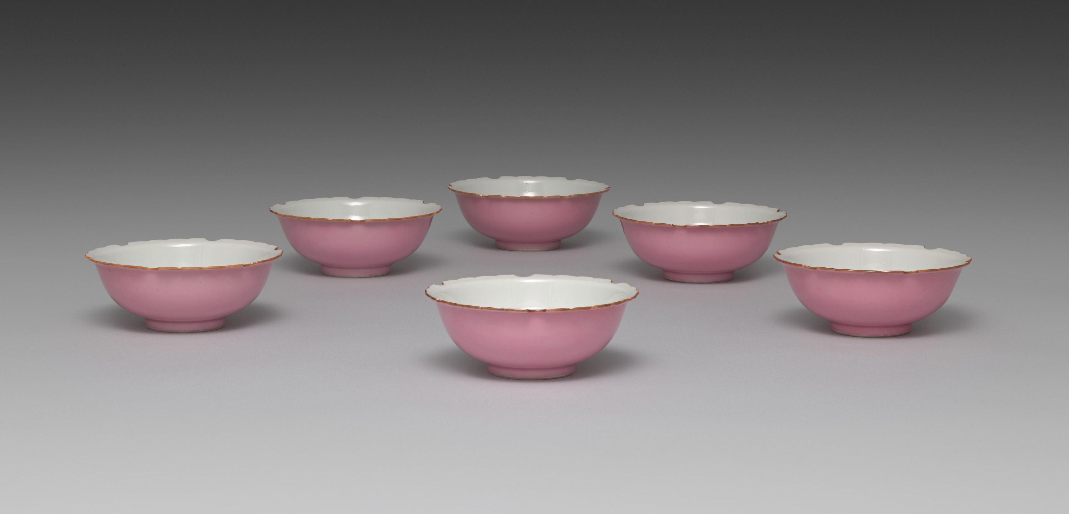 Snow-Flake Side Dishes by Seifū Yohei III: Seven small, pink ceramic bowls arranged in a triangular formation; the inner surfaces are white with a scalloped edge; the outer surfaces are pink; a thin gold rim line encircles each bowl where the pink exterior meets the white interior; each bowl has a short foot; the background transitions from dark gray at the top to light gray at the bottom.