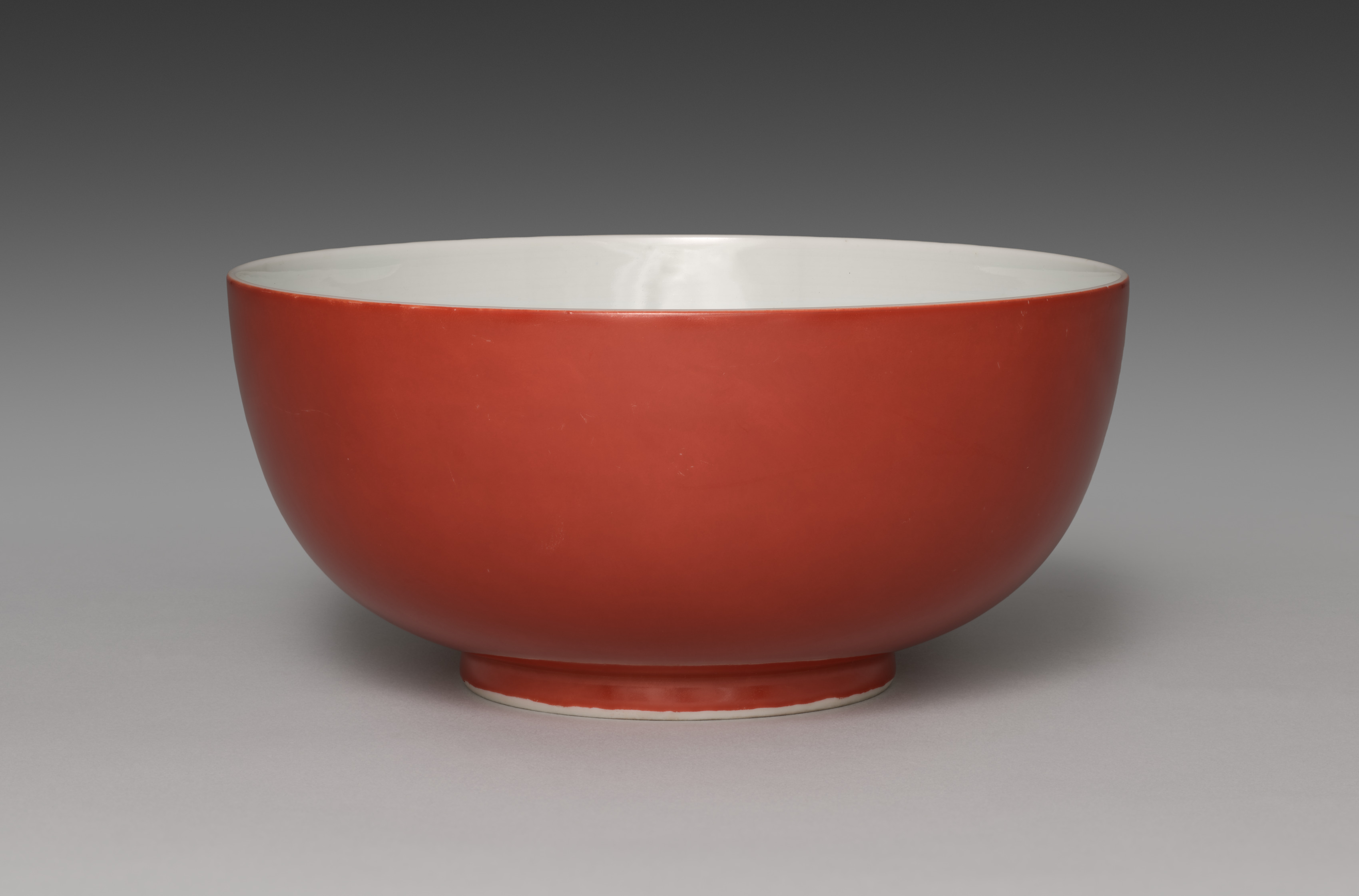 Red bowl with white interior and small foot. The bowl is a deep red color on the outside. The inside of the bowl is white. The bowl has a small foot at the bottom. The foot has a white edge. The background is gray and darkens towards the top. The bowl is by Seifū Yohei IV and is titled "Sweets Bowl".