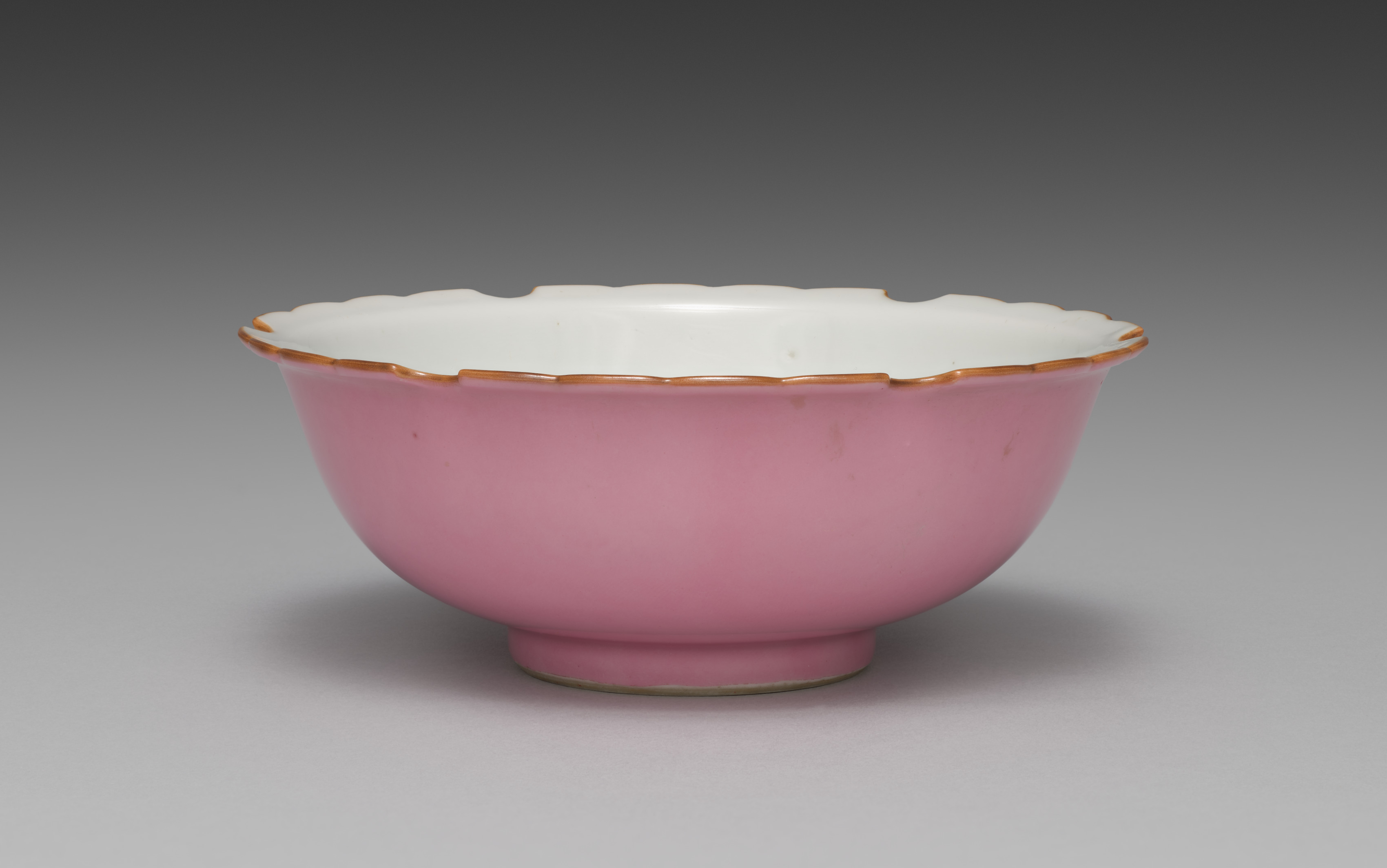 Pink bowl with a white interior and gold trim around the rim. The bowl has a scalloped edge. The exterior is a solid pink color. The bowl has a short foot at the base. The background is gray, with the bowl casting a shadow.