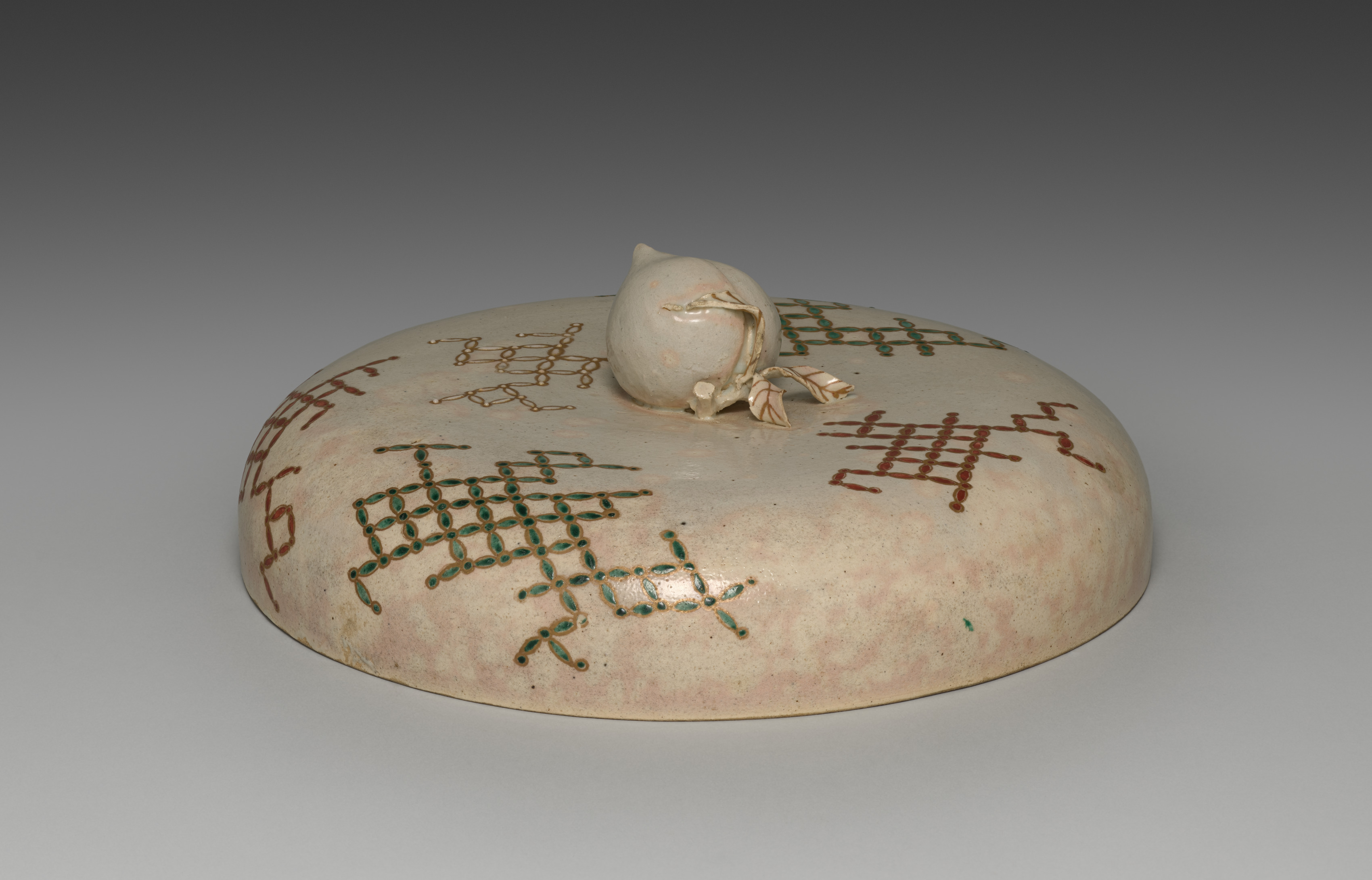 The cover for a bowl with a knob on top resembles a domed lid. The main body of the lid is off-white, exhibiting a subtle pinkish hue. The lid features a repeating pattern of intersecting lines forming a grid-like design, with some areas filled in. The intersecting lines form a grid-like design, with some areas filled in green and others in red. A small knob protrudes from the center of the lid, resembling a fruit or vegetable. The knob is off-white and has a small stem attached to it. The background of the image is a gradient, transitioning from dark gray at the top to light gray at the bottom.