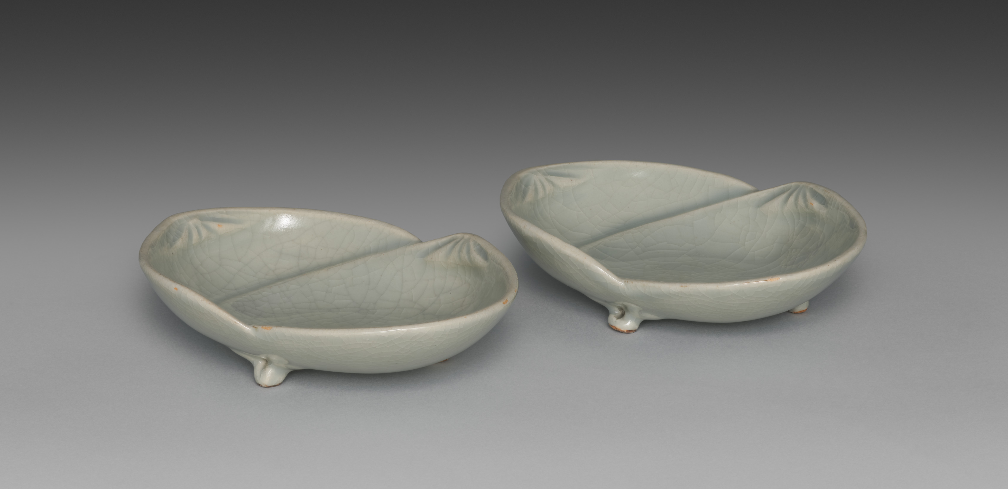 Two light green saucers with feet, divided into two sections. The saucers are shaped like leaves. The feet are small and rounded. The saucers have a glossy finish and a crackle pattern. They are placed on a gray surface. The background is dark gray at the top and light gray at the bottom. The artist is Seifū Yohei III and the title is Saucers with Matching Shells.