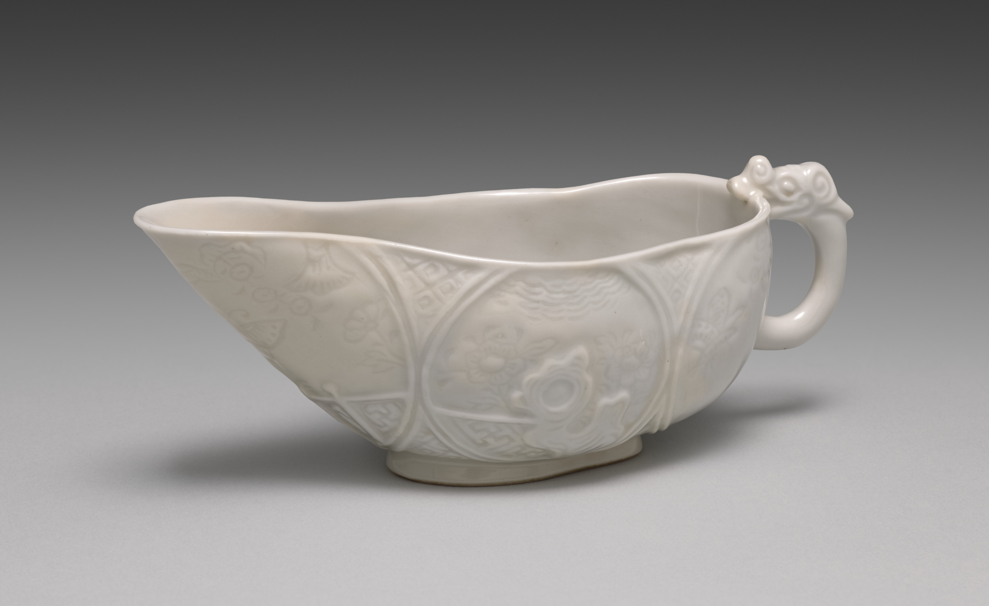 White ceramic bowl with handle and embossed design. The bowl features a wide mouth that tapers inward slightly toward the base. The exterior of the bowl has a raised, embossed design, including curved lines and floral motifs. The handle, located on one side, curves outward and features a decorative element near the top. The background of the image transitions from dark gray at the top to light gray at the bottom. The bowl casts a shadow on the surface below it. The title of the work is "Water Cooler with Chinese Gardens" and it is by Seifū Yohei III.