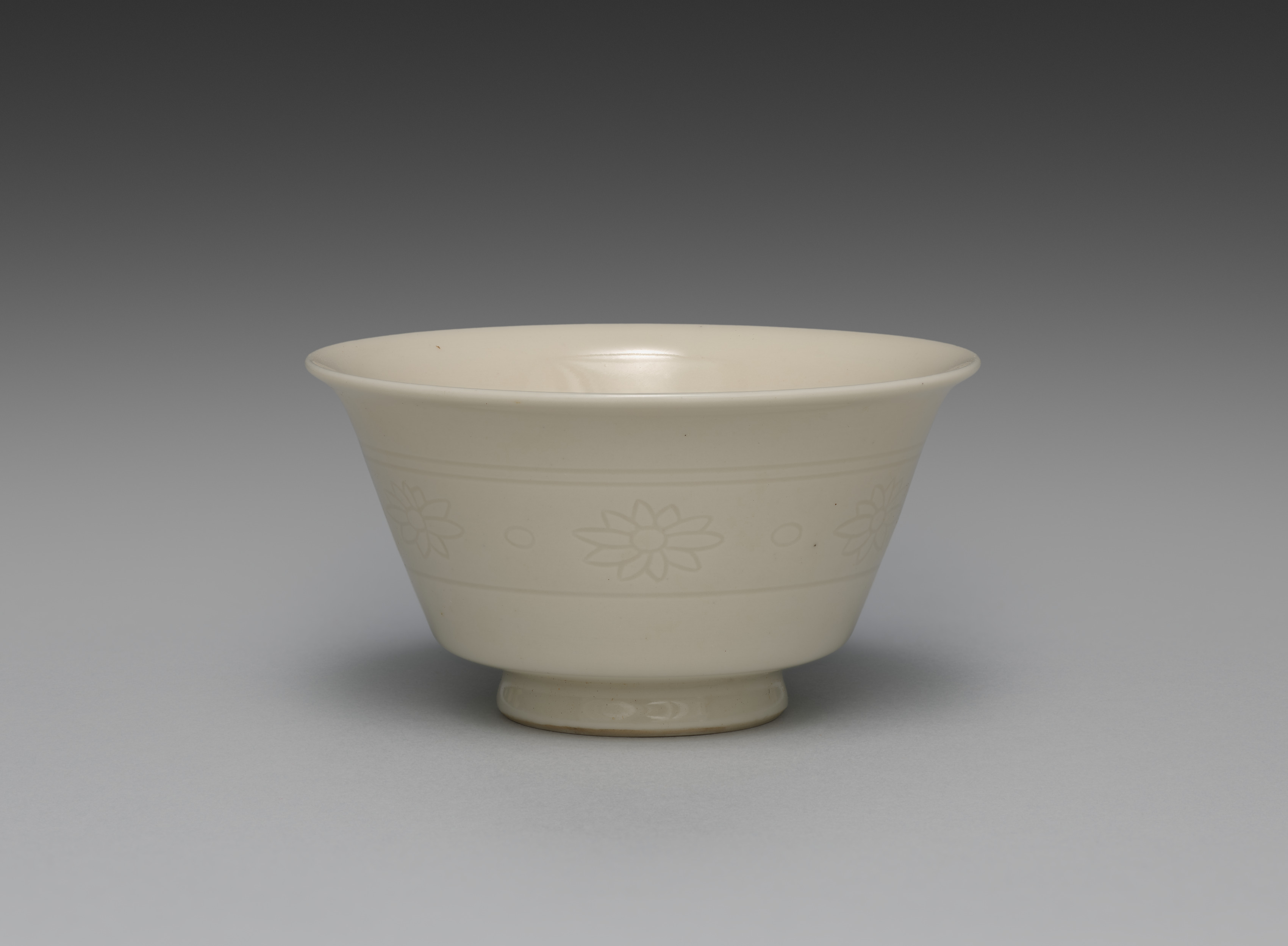 White teacup with a floral band motif. The cup is tapered with a narrow base and wide mouth. Two horizontal lines encircle the cup above and below a band of raised floral motifs. The background is gray with a gradient from dark at the top to light at the bottom. The cup sits on a surface with a small shadow underneath.