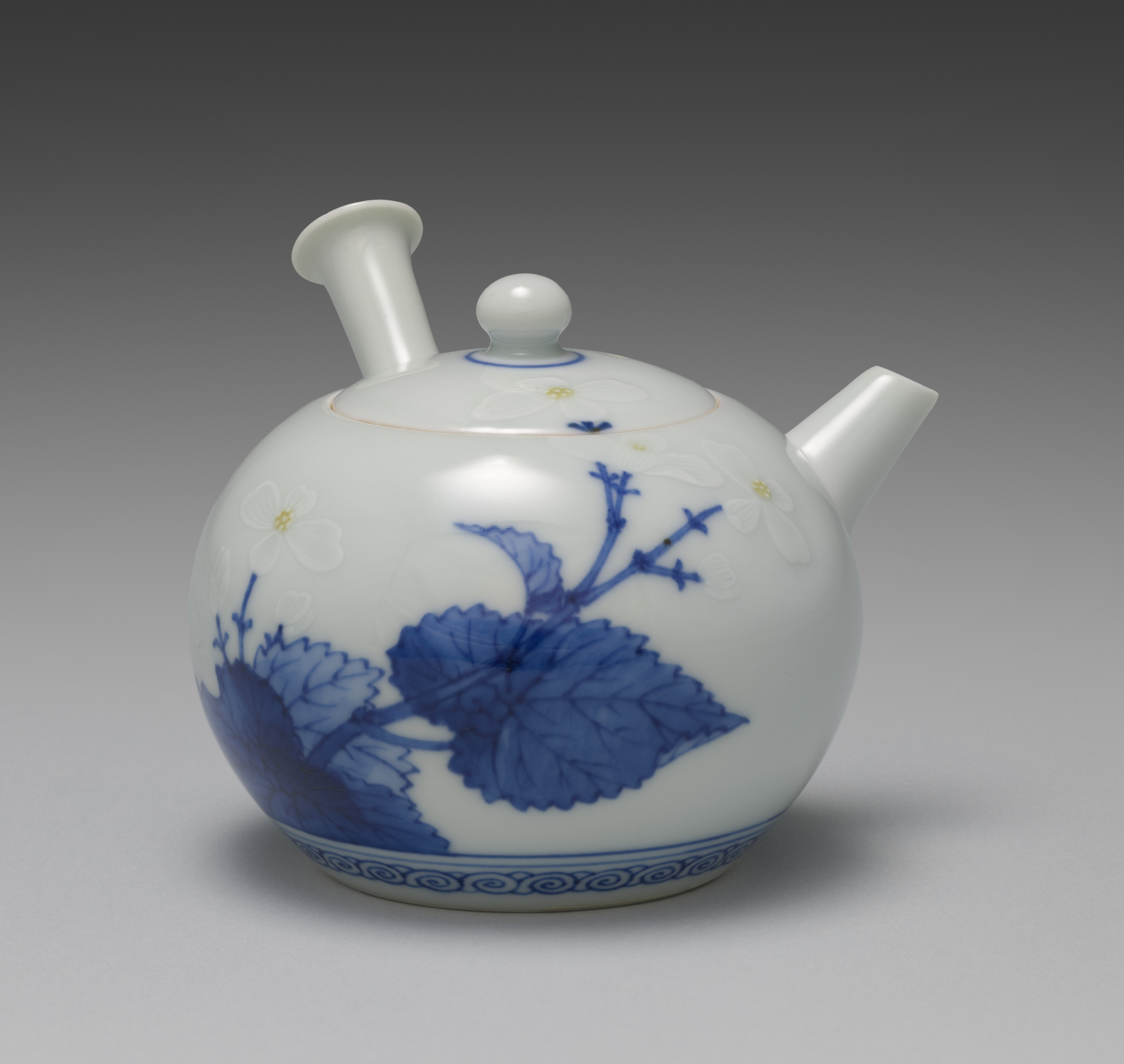 White teapot with blue floral designs and a short spout to the right; a small knob on top of the lid; a small handle on the back; a blue line design around the bottom; on a gray background. Teapot with Begonias by Seifū Yohei III.