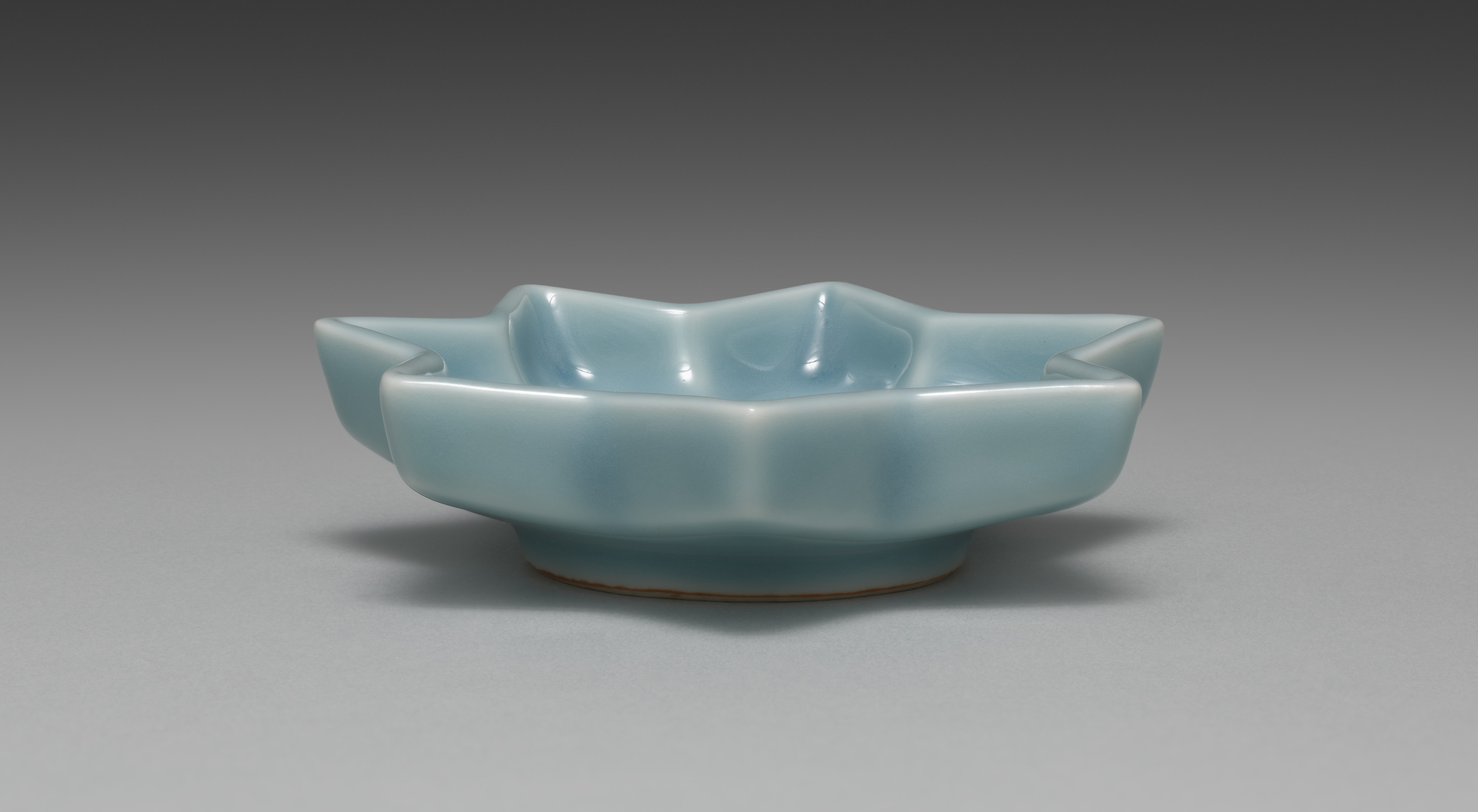 Maple leaf-shaped saucer, light blue ceramic with glossy glaze, maple leaf-shaped rim with wavy edges, short base with a brown rim, centered on a gray background with a darker gray gradient at the top.