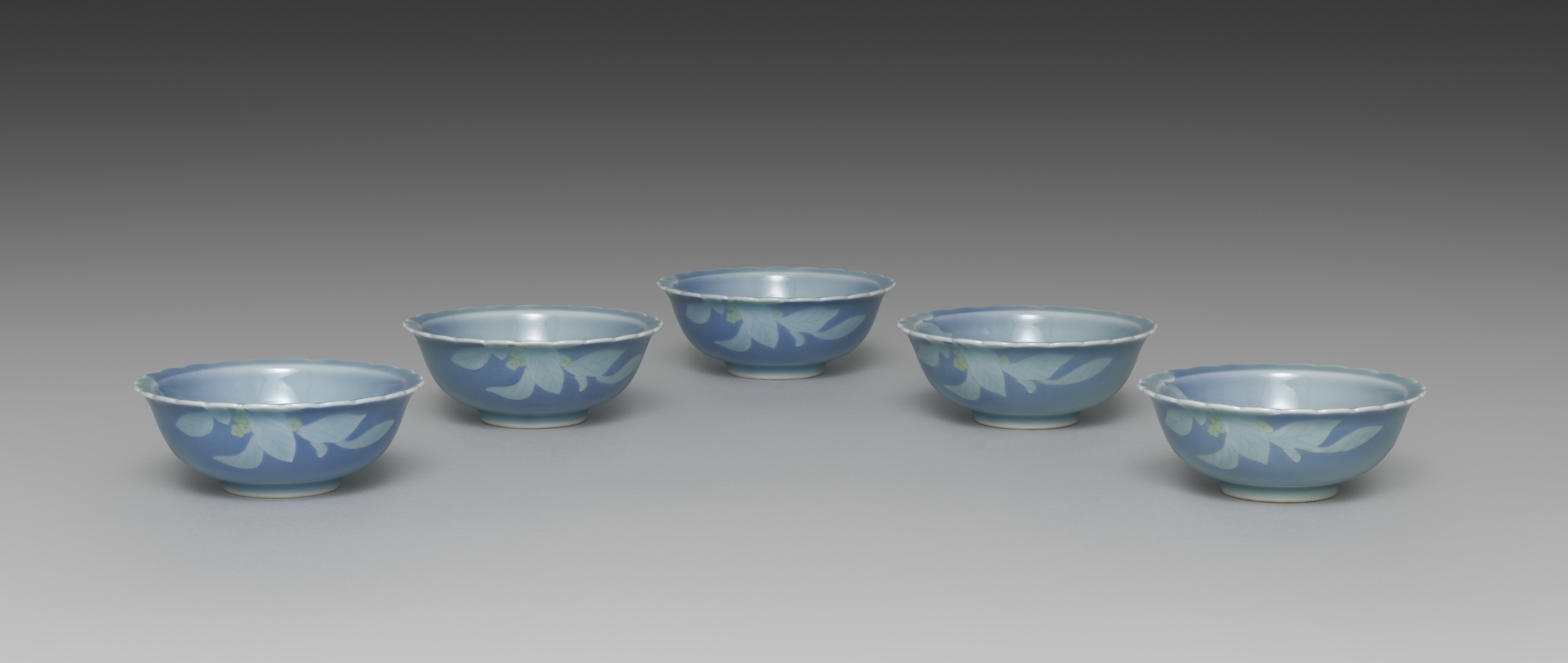 Five small, blue ceramic bowls with a floral pattern. The bowls are arranged in a curved line. They have a light blue interior and exterior with a darker blue floral pattern around the exterior. The floral pattern features white flowers with yellow centers. The rims of the bowls are rough and uneven. The background is a gradient from dark gray at the top to light gray at the bottom. Seifū Yohei IV, Dishes with Flowers.