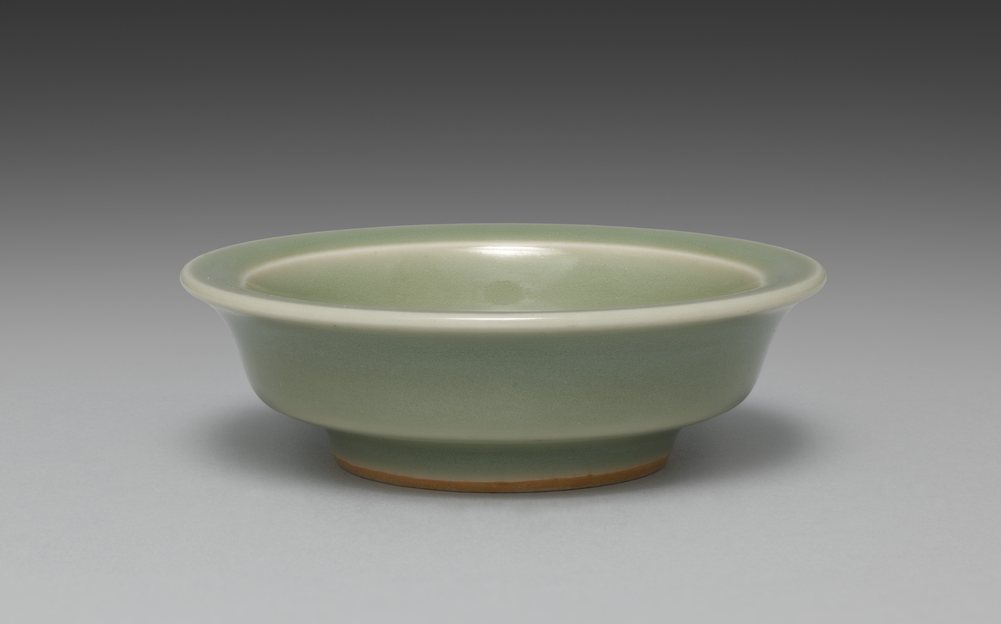 The image shows a ceramic bowl with a light green glaze, titled "Saucer" by Seifū Yohei III. The bowl is positioned centrally in the image. The bowl's exterior and interior are covered in a light green glaze. The bowl has a wide mouth and a narrow base. The base of the bowl is a light brown color, likely the natural clay body of the ceramic. The bowl's shape is rounded, with a slight curvature from the base to the rim. The rim is slightly flared. The background of the image is a gradient that transitions from dark gray at the top to light gray at the bottom. A shadow is cast by the bowl onto the surface below it.