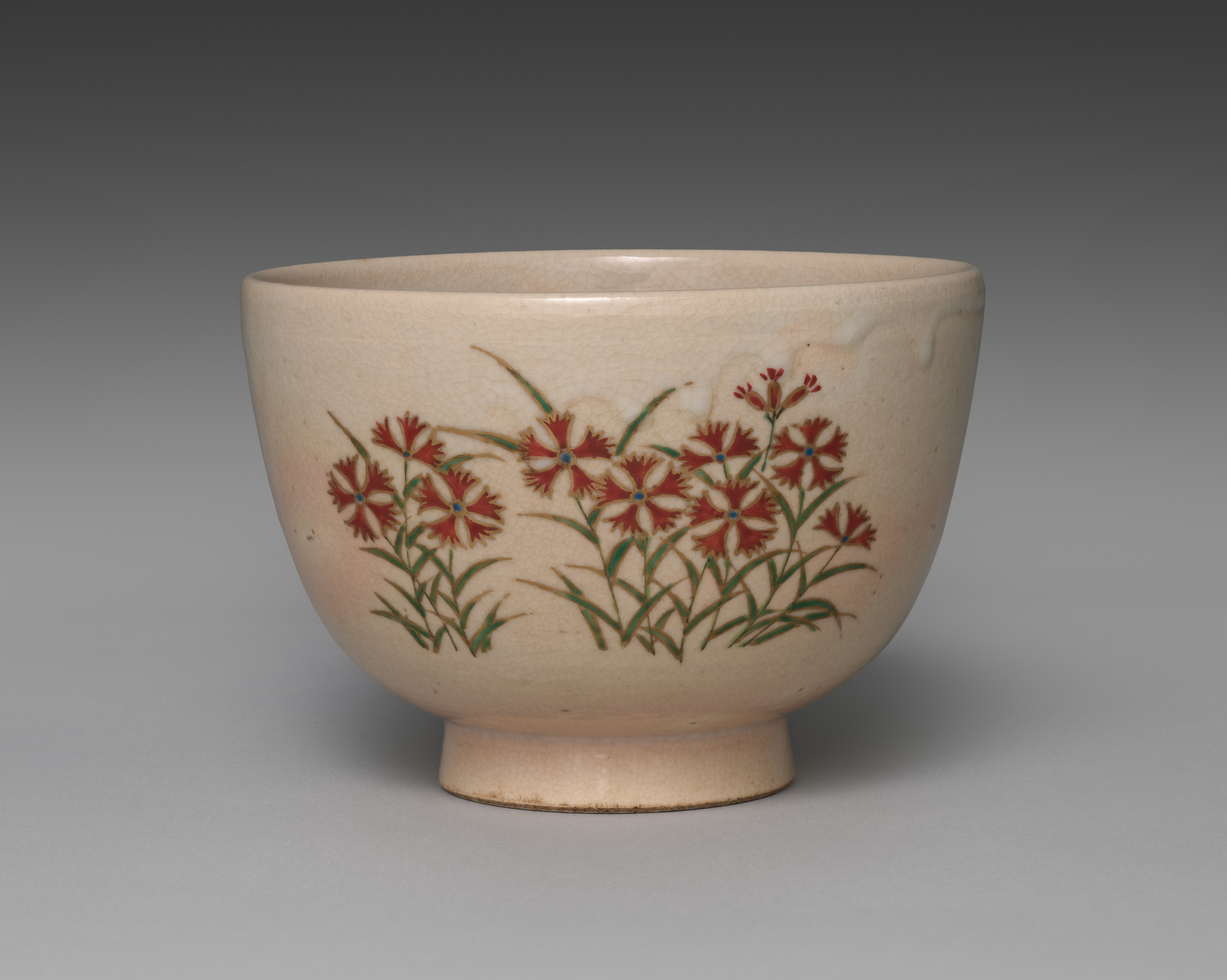 Teabowl with Pinks by Seifū Yohei III: The object is a short ceramic bowl. The bowl has a rounded body with a narrow base. The bowl is beige with a crackle pattern. There is a design on the body of the bowl. The design features green stems and leaves with red flowers. The flowers have multiple petals. The background of the image transitions from dark gray at the top to light gray at the bottom. The bowl casts a shadow on the surface below.