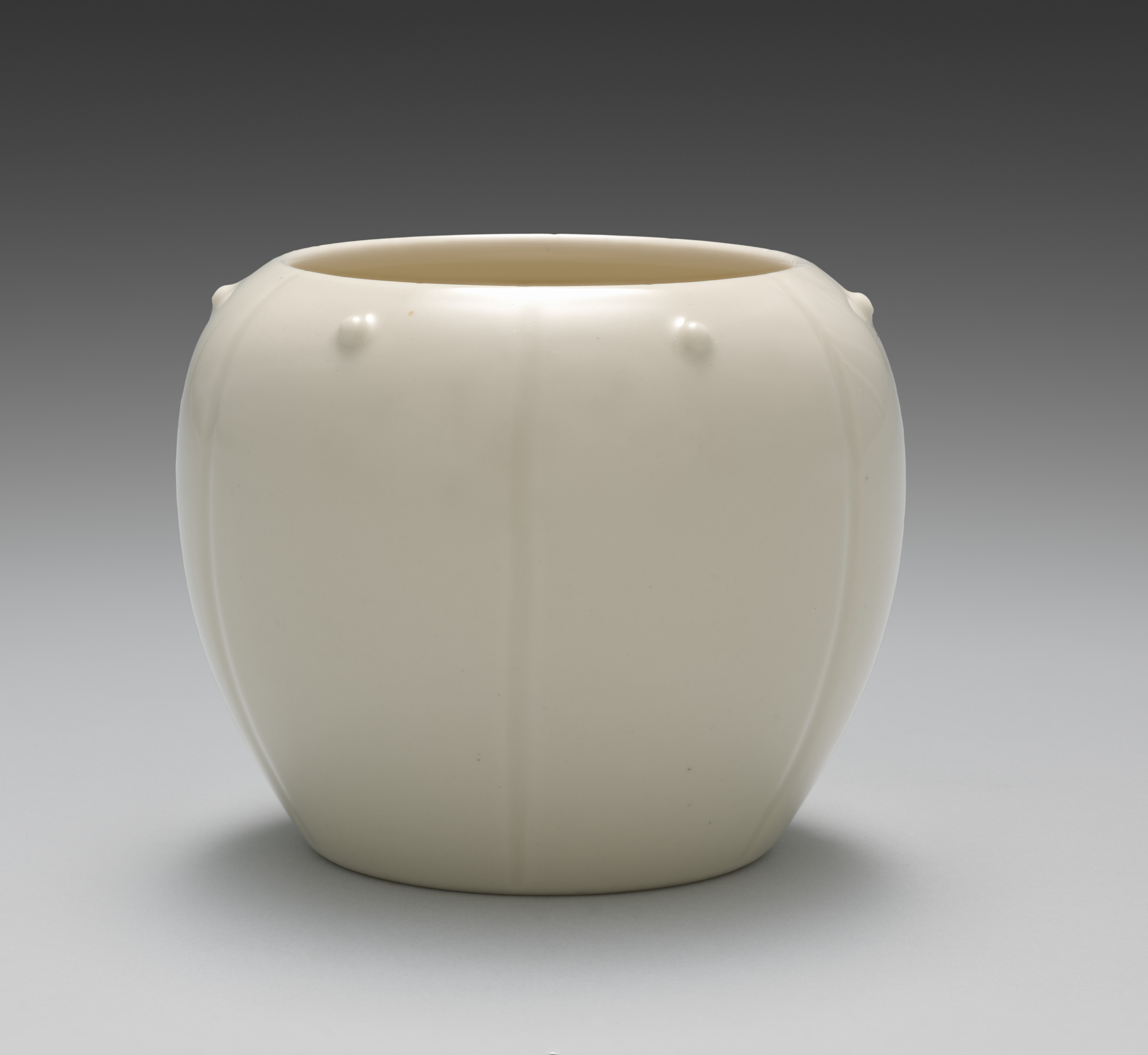White ceramic container with a rounded body and narrow opening at the top. The body has vertical lines running down it. Two small protrusions on either side near the top. The background is a gradient from dark gray at the top to light gray at the bottom. The container sits on a light gray surface with a shadow underneath.