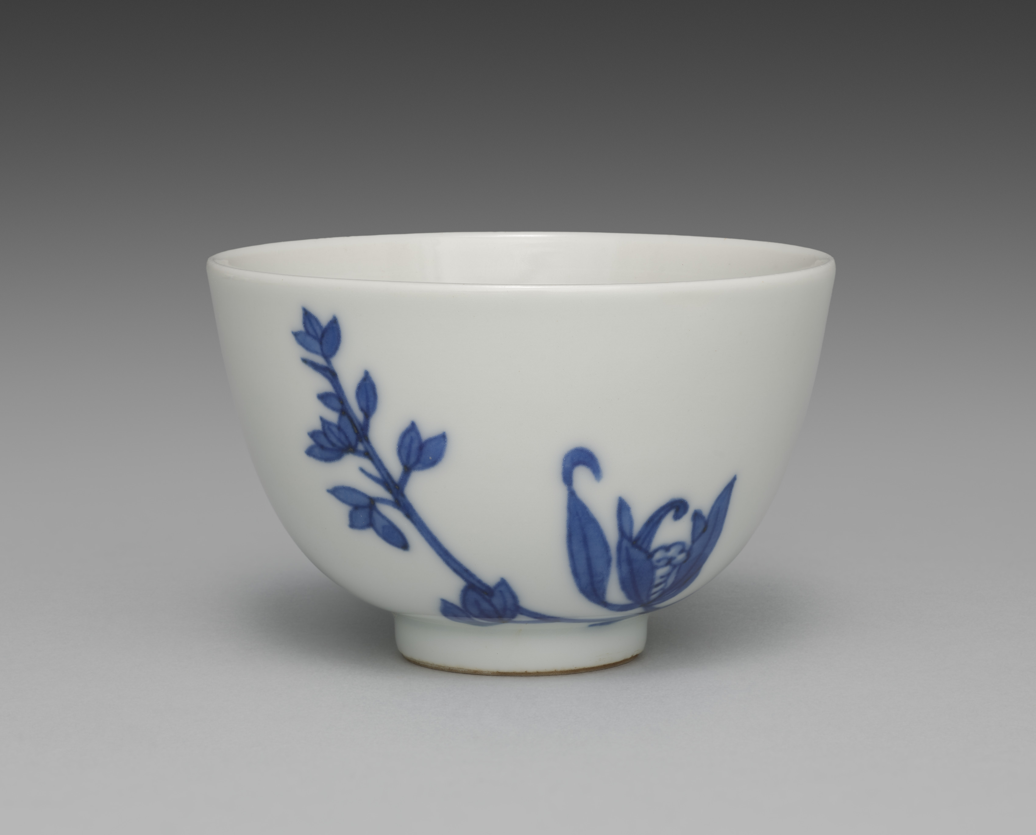 White teacup with blue floral design. The teacup is round and has a small foot at the bottom. The floral design consists of a stem with leaves and an orchid. The stem and leaves are on the left side of the cup, curving to the right. The orchid is on the right side. The background of the image is gray, getting darker toward the top. The teacup is by Seifū Yohei III, and is part of a tea set with orchids.