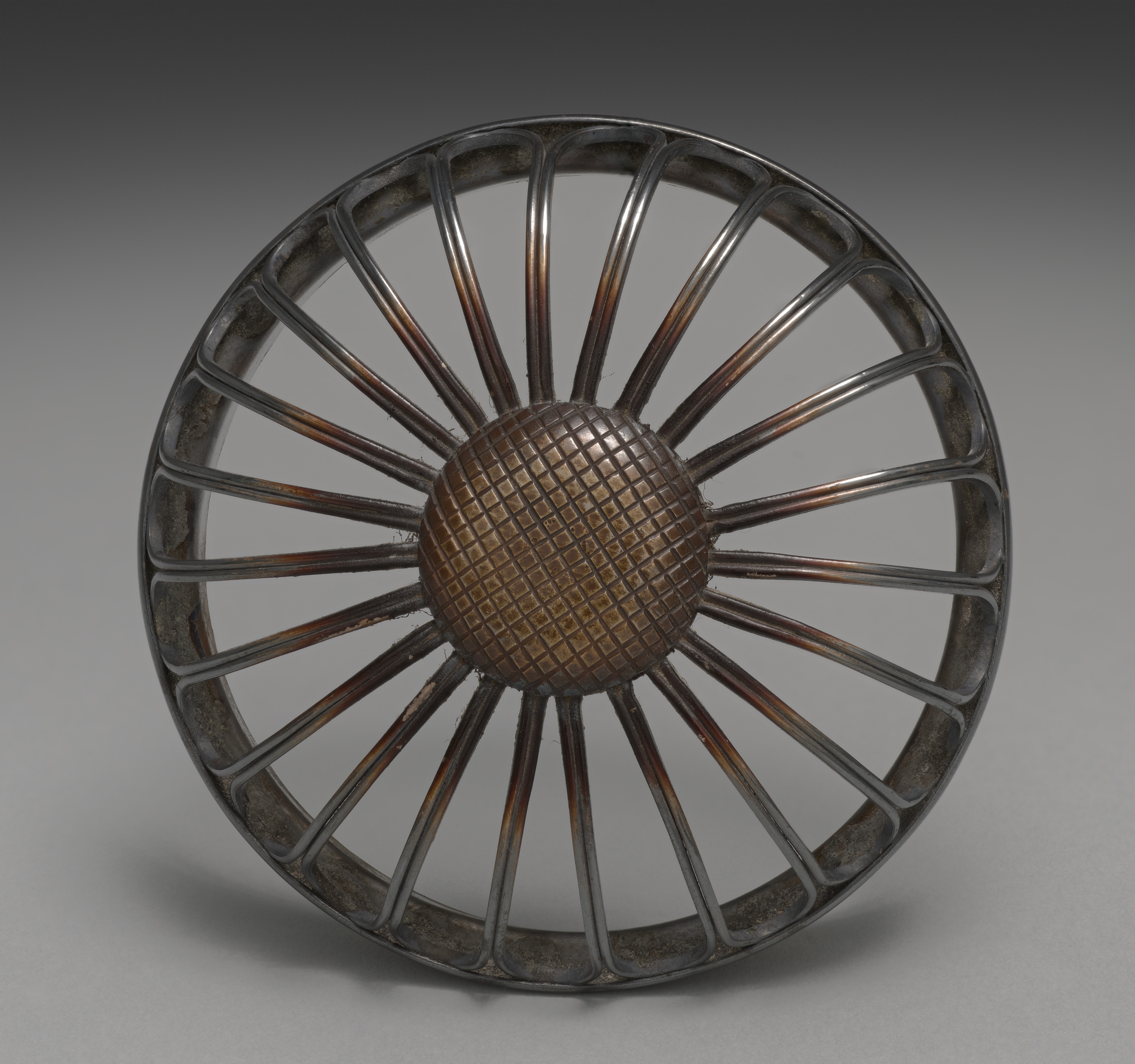 Round metal object with a central sphere. The central sphere is covered in a grid pattern. The central sphere is surrounded by radiating metal spokes. The metal spokes are thin and taper to a point at the edge. The metal spokes are connected to a circular frame. The object has a dark brown and gray color. The object appears to have a textured surface. The background is gray with a gradient to black at the top. The object casts a shadow on the surface below.