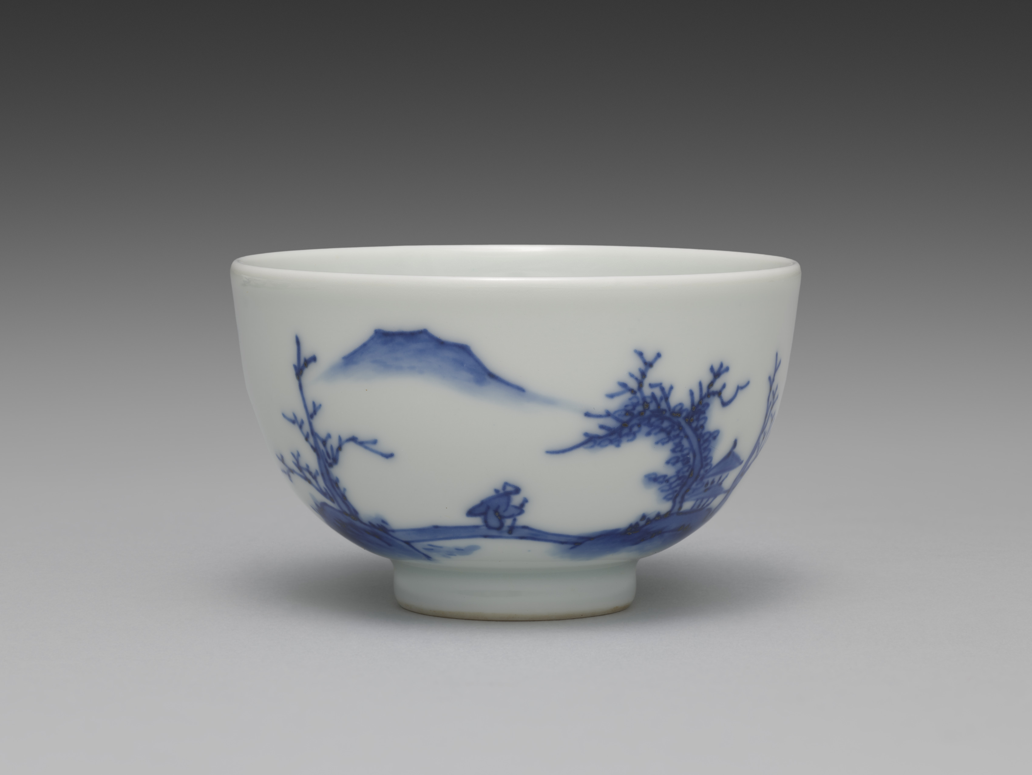 White porcelain teacup with blue underglaze decoration. The teacup is short and wide. The base of the teacup is small and rounded. The body of the teacup is bulbous and curves inwards to form the mouth of the cup. The exterior of the teacup has a blue underglaze design depicting a Chinese landscape. The design features mountains, trees, and a temple or building. The background of the image is grey, transitioning from dark at the top to light at the bottom. The teacup casts a shadow on the surface below.