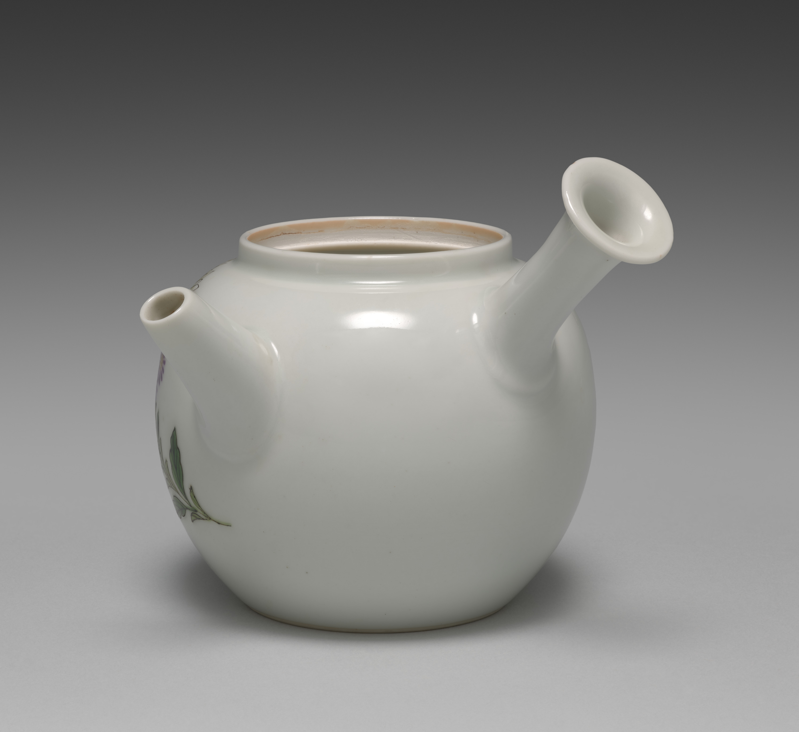 White teapot with rounded body and short spout, second small opening on the side; floral design on the side; by Seifū Yohei III.