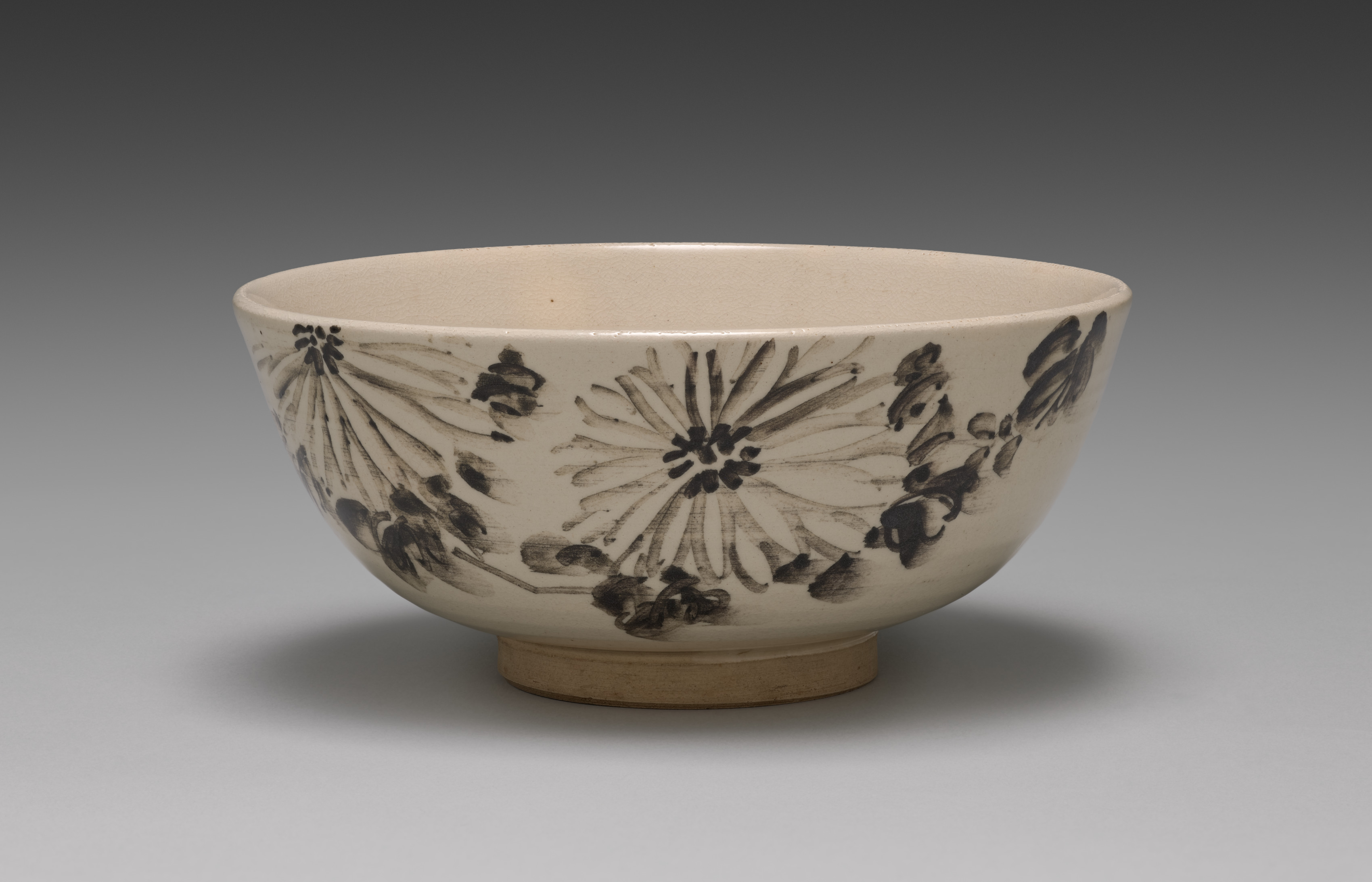 Bowl with Chrysanthemums by Seifū Yohei IV: A white ceramic bowl with a rounded shape and a short foot. The bowl features a black floral design with chrysanthemums. The interior of the bowl is plain and smooth. The background is a gradient of dark gray to light gray. The bowl casts a shadow on the surface below it. The overall color scheme is monochromatic, with shades of white, beige, and black. The bowl appears to be handmade, with slight imperfections on the surface. The foot of the bowl is a light brown color. The floral design is painted in a simple, yet elegant style.