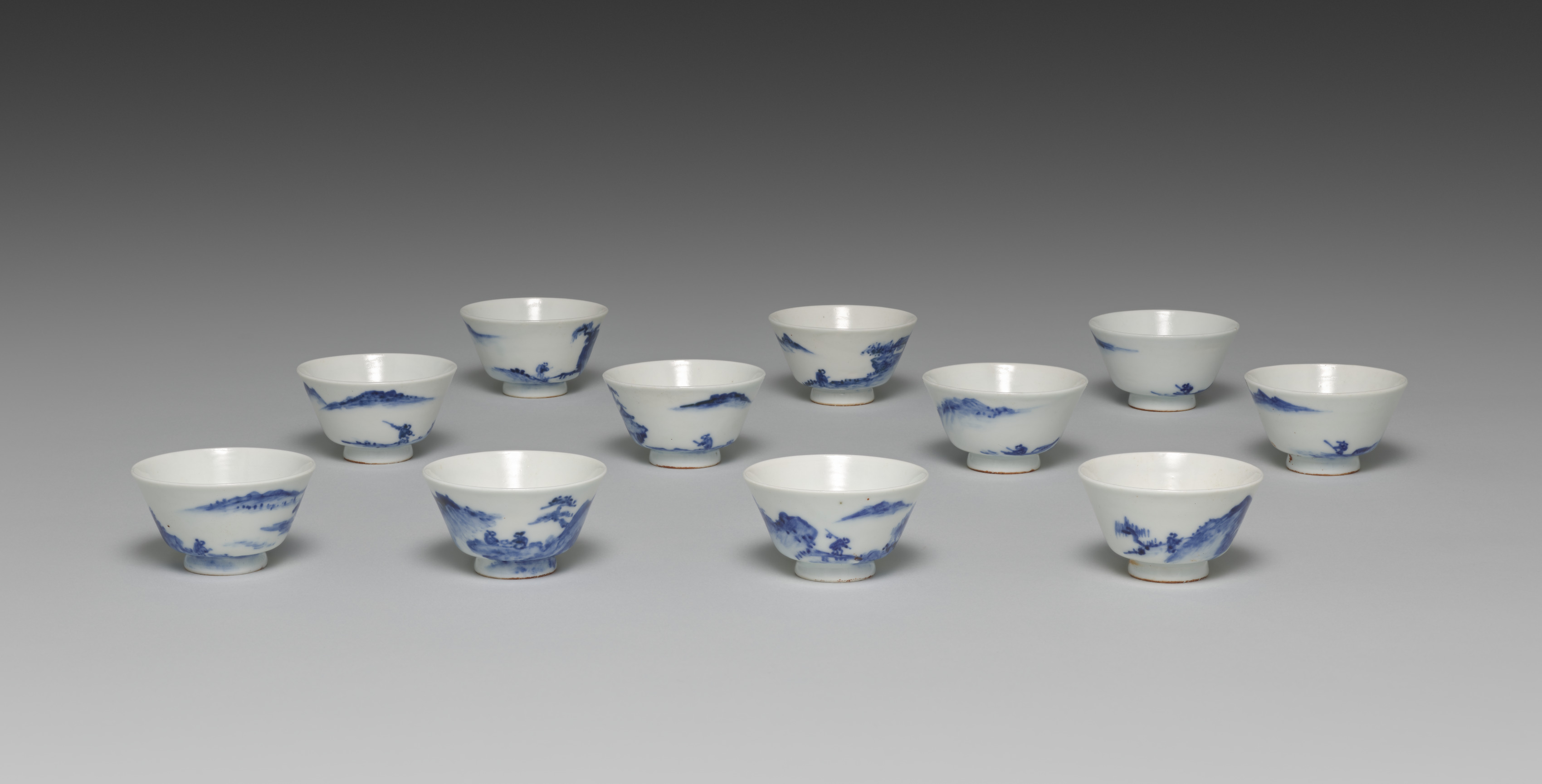 Twelve small white teacups, each with a blue and white landscape design featuring varying scenes; some teacups have mountains and trees on the left side; others have a pagoda or trees on the right; and some have mountains on both sides. The teacups are arranged in three rows on a gray surface that fades to dark gray at the top. The teacups are the work of Seifū Yohei IV, and are titled "Teacups with Chinese Landscapes".