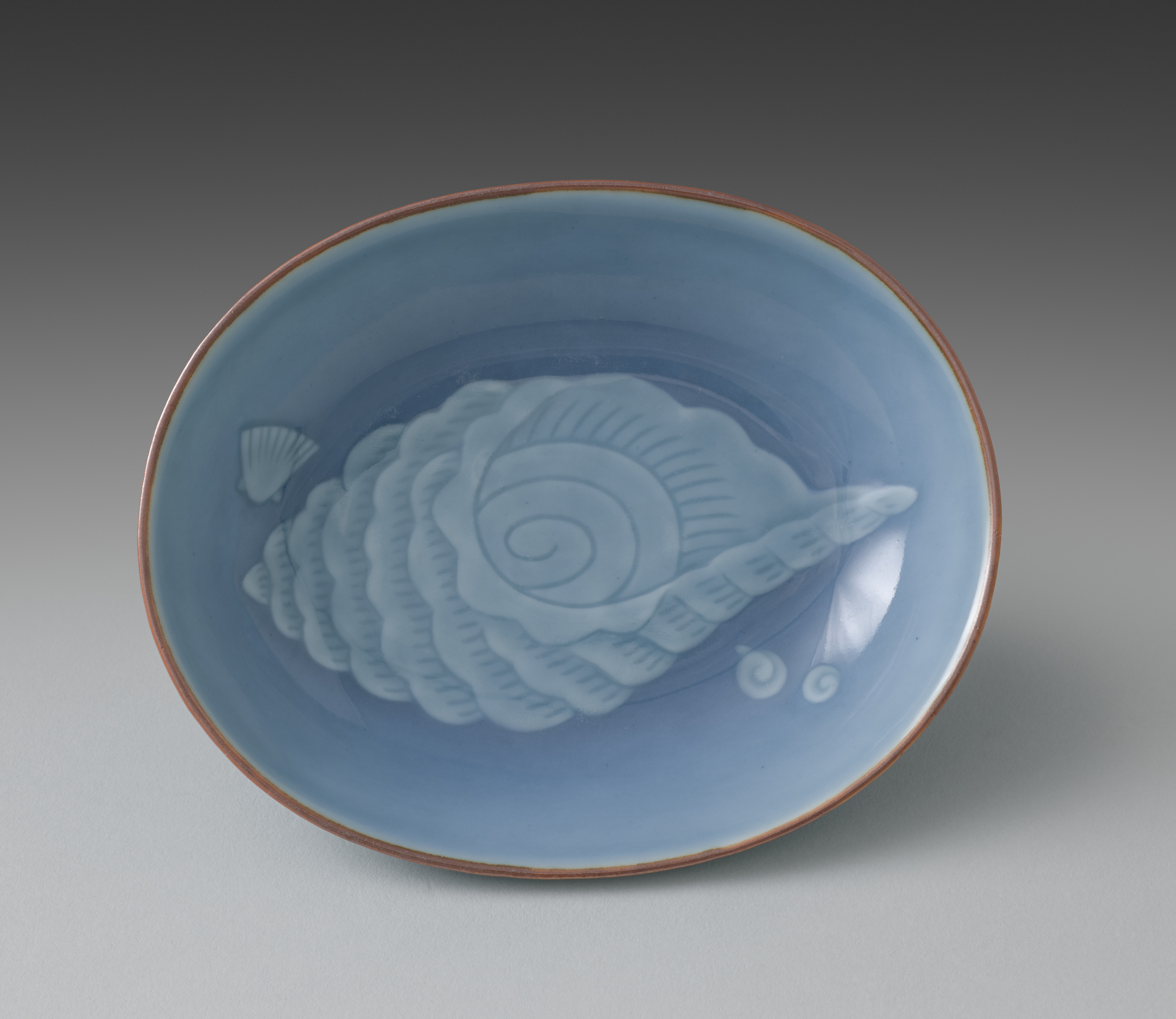 Light blue bowl with brown rim, shell design on inside. The bowl is round and has a glossy finish. The shell design is in the center of the bowl, with a spiral shape in the middle and ridges on the outside. The shell design is white. The background is gray and darkens towards the top. The bowl casts a shadow on the surface below it. The bowl is titled "Dish from Dishes with Shells" by Seifū Yohei IV.
