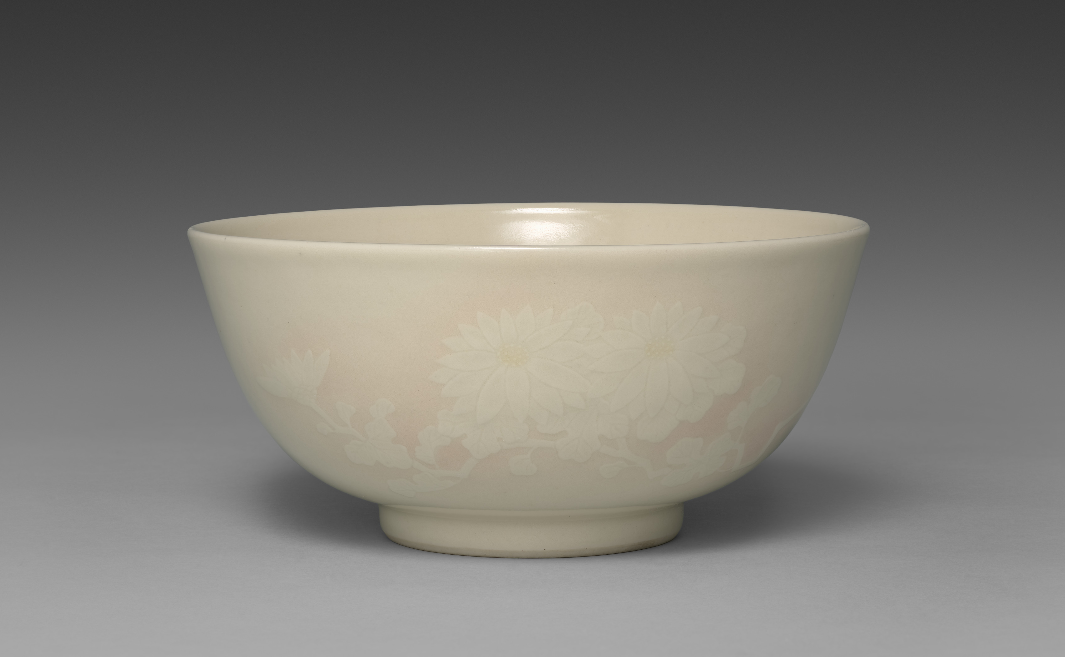 Off-white ceramic bowl with a wide mouth and a short foot. The bowl features a design of chrysanthemums in a lighter shade of off-white. The background of the image transitions from dark gray at the top to light gray at the bottom. The bowl casts a shadow on the surface below it.