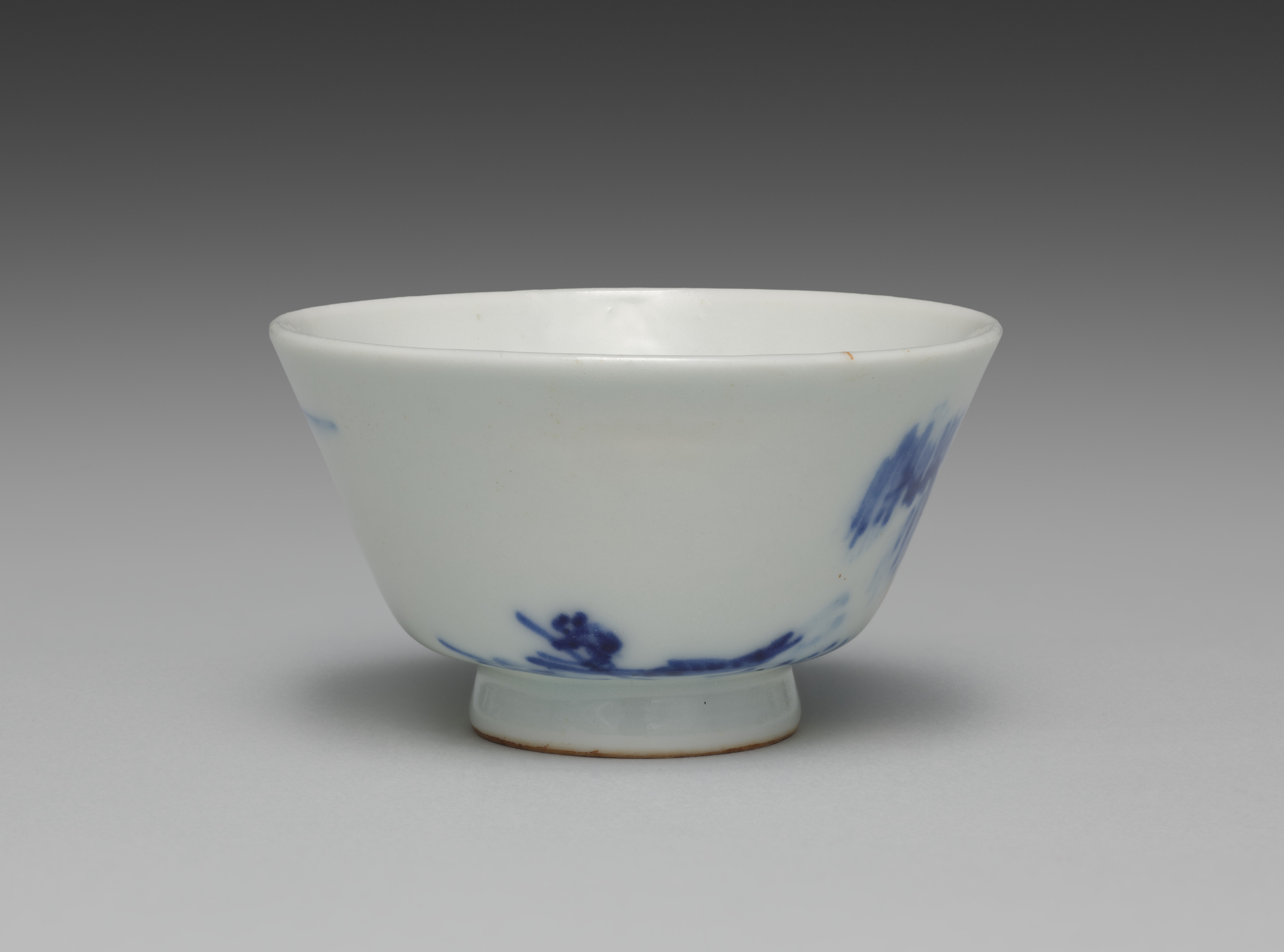 White teacup with blue floral design on a gray background. The teacup is predominantly white with a wide mouth that tapers down to a narrow base. The base of the teacup is slightly wider than the foot. The teacup features a blue floral design. The background is a gradient of gray, darker at the top and lighter at the bottom. The teacup casts a shadow on the surface below it.