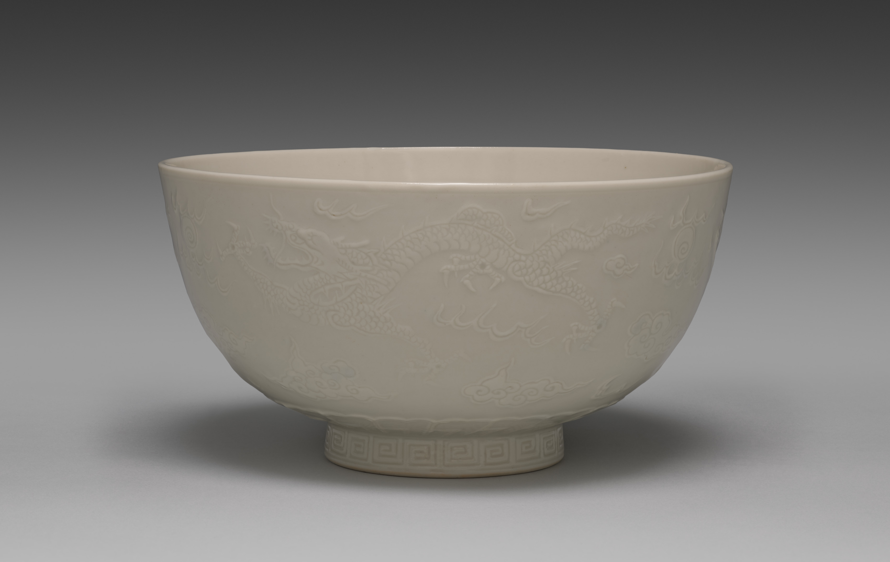 White bowl with wide mouth and short foot. The body of the bowl features an embossed design depicting dragons chasing flaming jewels amidst clouds. The foot of the bowl has a geometric pattern. The background of the image is a gradient from dark gray at the top to light gray at the bottom. The bowl casts a shadow on the surface below it.