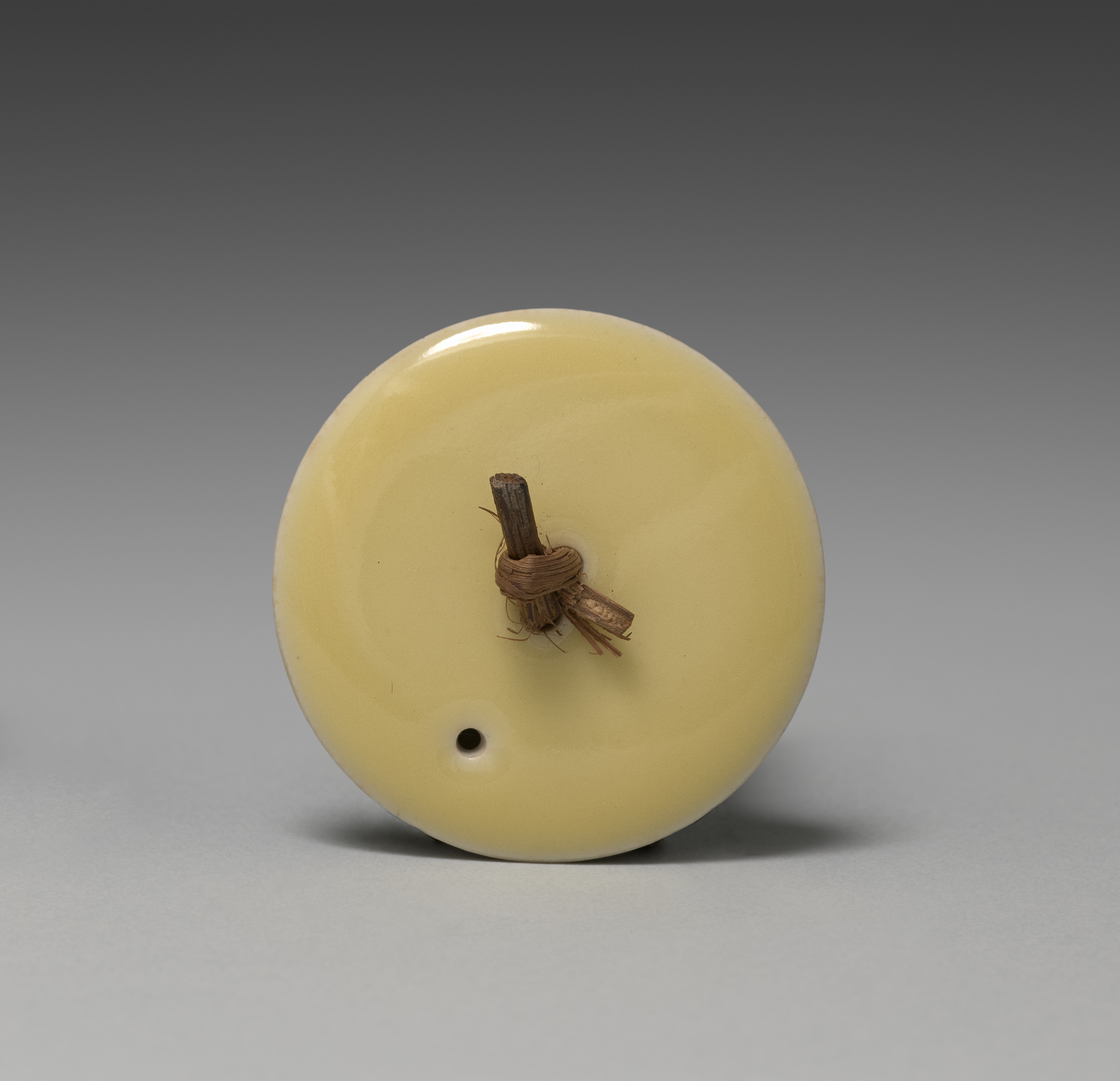 Round, flat, pale yellow ceramic lid with a small hole at the bottom left and a small wooden handle wrapped with brown twine in the center. The lid is glossy and has a slight shadow underneath. The background is a gradient from dark gray at the top to light gray at the bottom.