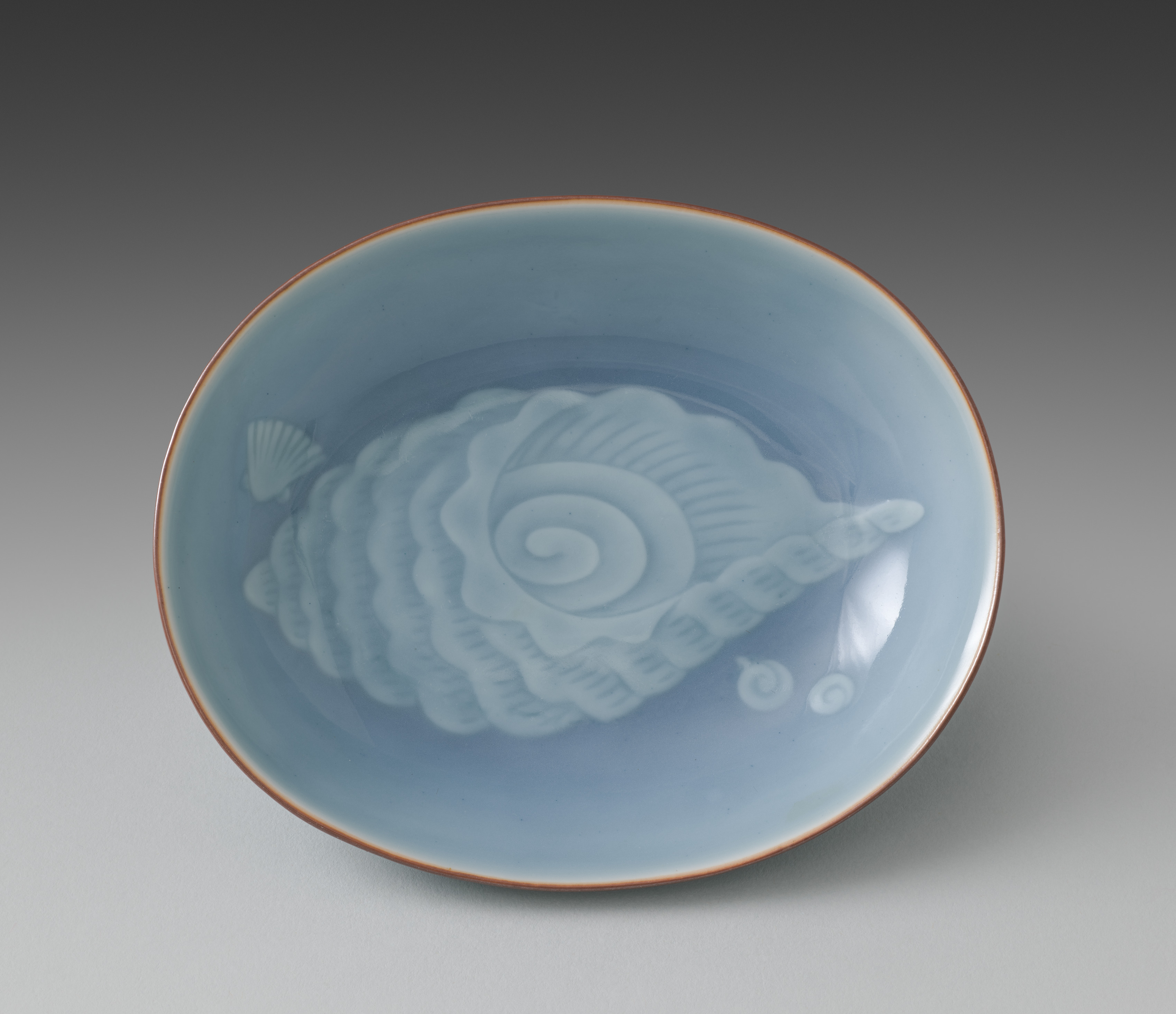 Round, light blue bowl with a brown rim, featuring a white design of a scallop shell or a nautilus shell on the inside. The bowl is shallow and has a wide mouth. The design is centered and takes up most of the interior surface. The background is a gradient from dark gray at the top to light gray at the bottom.