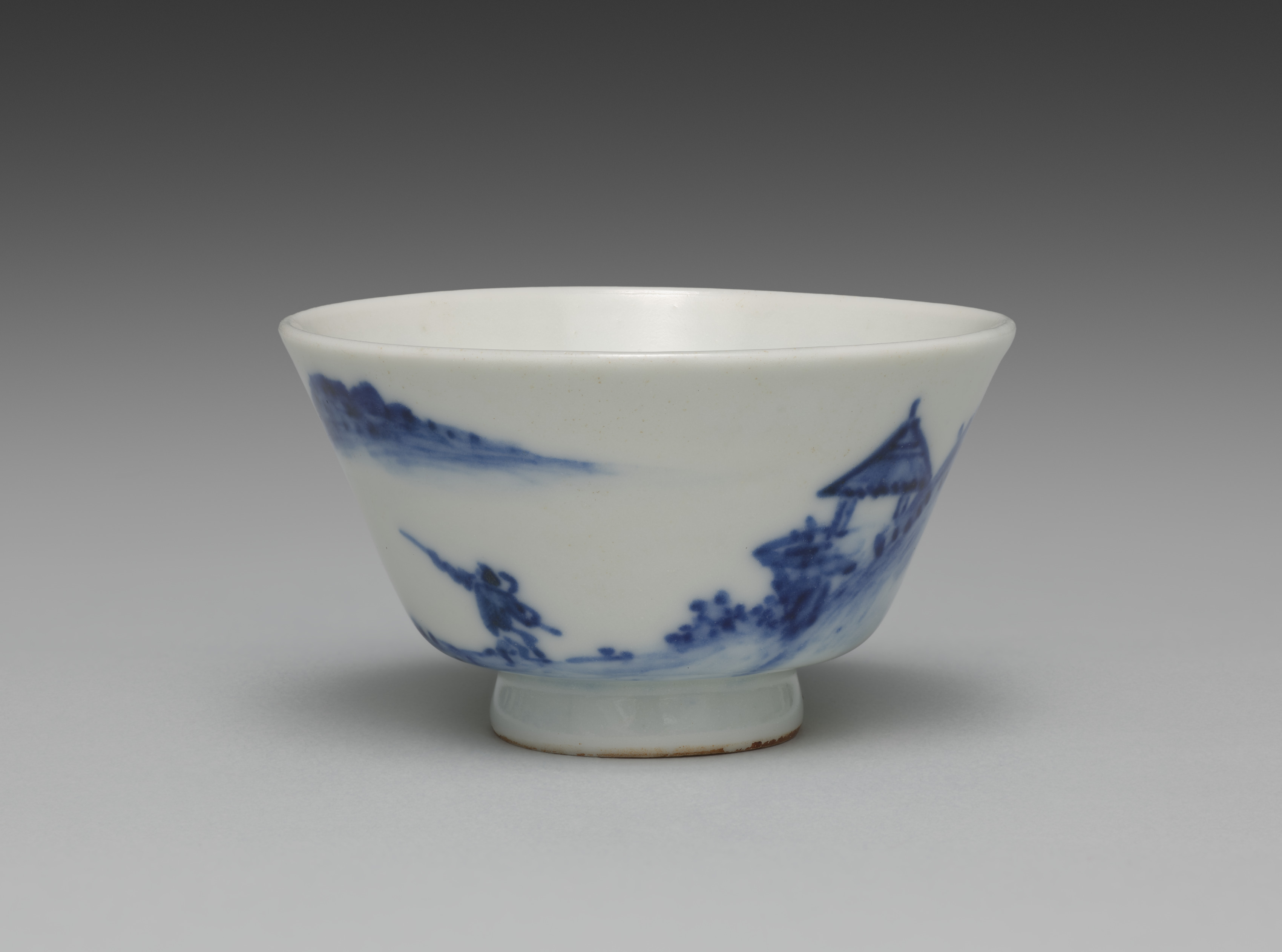 White teacup with a wide mouth and a narrow base. The teacup is decorated with blue landscape scenes. The background of the image is a gradient from dark gray at the top to light gray at the bottom. The teacup casts a shadow on the surface below it. The teacup is titled "Teacup" and is from the series "Teacups with Chinese Landscapes" by Seifū Yohei IV.