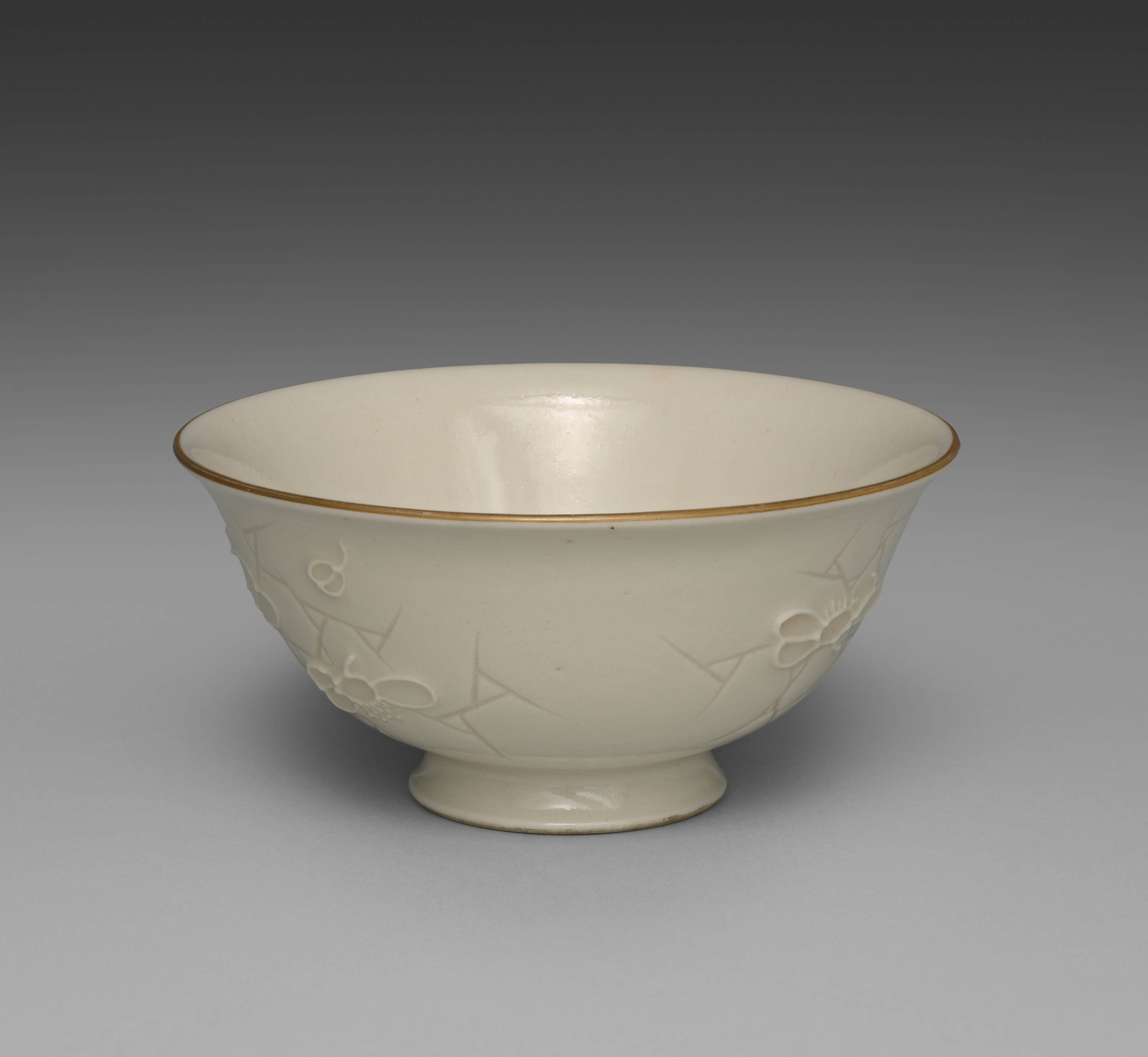 White bowl with gold rim, featuring embossed plum blossoms and cracked-ice pattern. The bowl has a wide mouth and a short foot. The cracked-ice pattern resembles broken ice or cracked surfaces. The gold rim adds a decorative touch to the otherwise simple design. A short stem connects the bowl to its base.