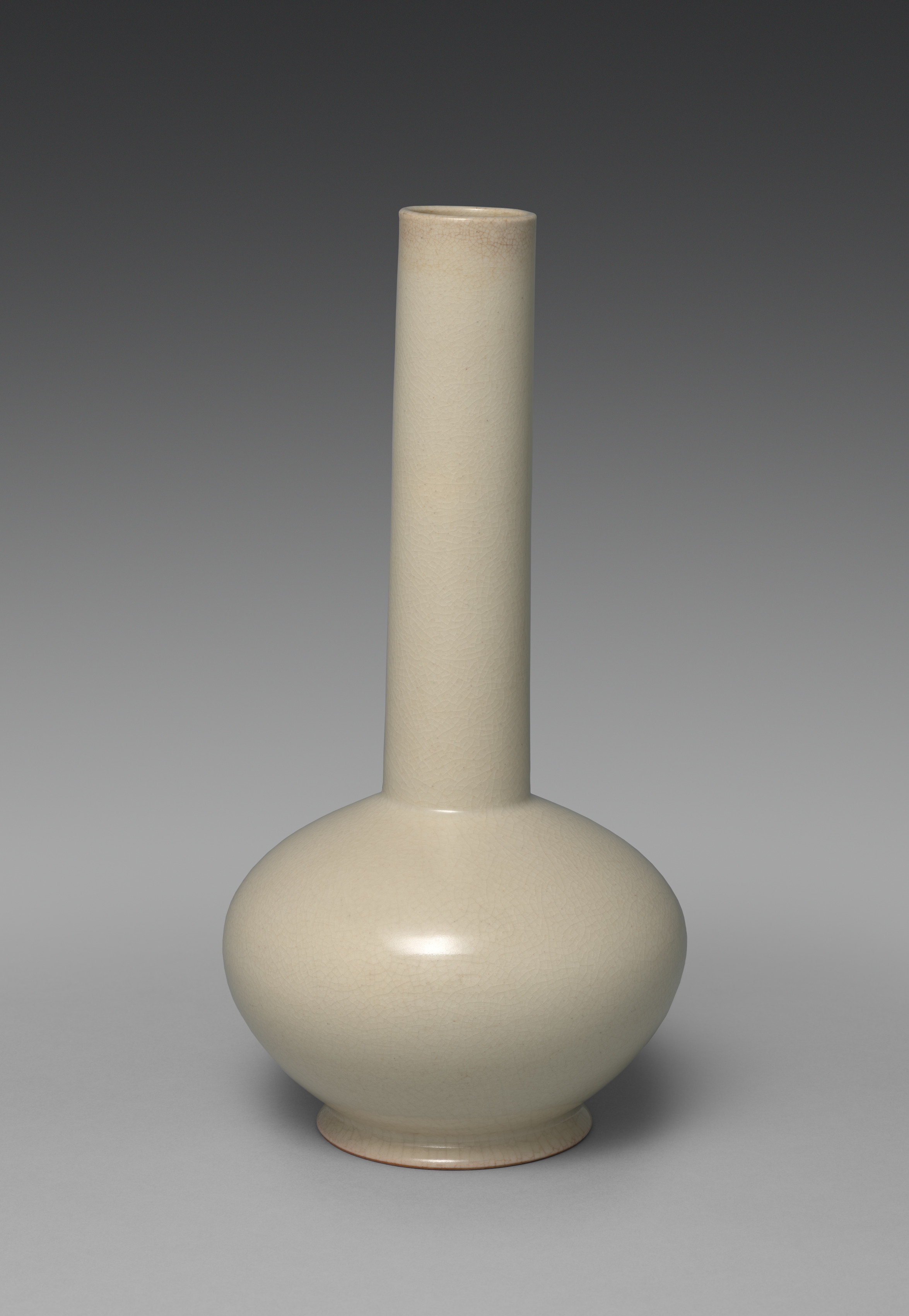 The Long-Necked Vase by Seifū Yohei III is a ceramic vase. It has an off-white color and a glossy finish. The vase has a bulbous body and a long, narrow neck. The base of the vase is short and circular. The background of the image fades from dark gray at the top to light gray at the bottom. The vase is centered in the image.