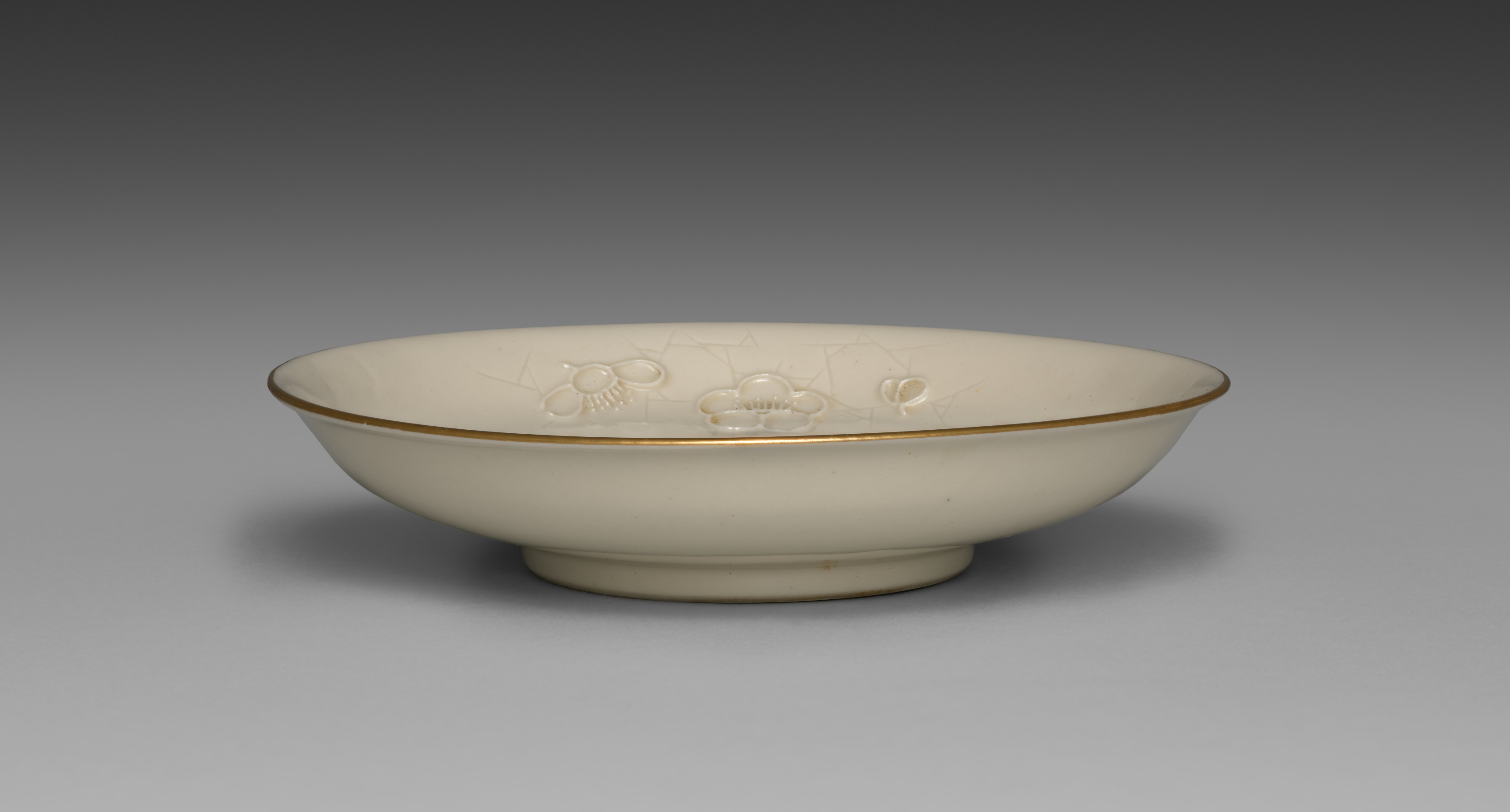 Medium-sized dish with a wide, rounded bowl and a short, narrow foot. The dish is primarily white with a cracked-ice pattern etched into the interior. The rim of the dish is trimmed with a thin gold line. Inside the bowl, there are raised images of plum blossoms. The background of the image is gray, with the dish casting a shadow.