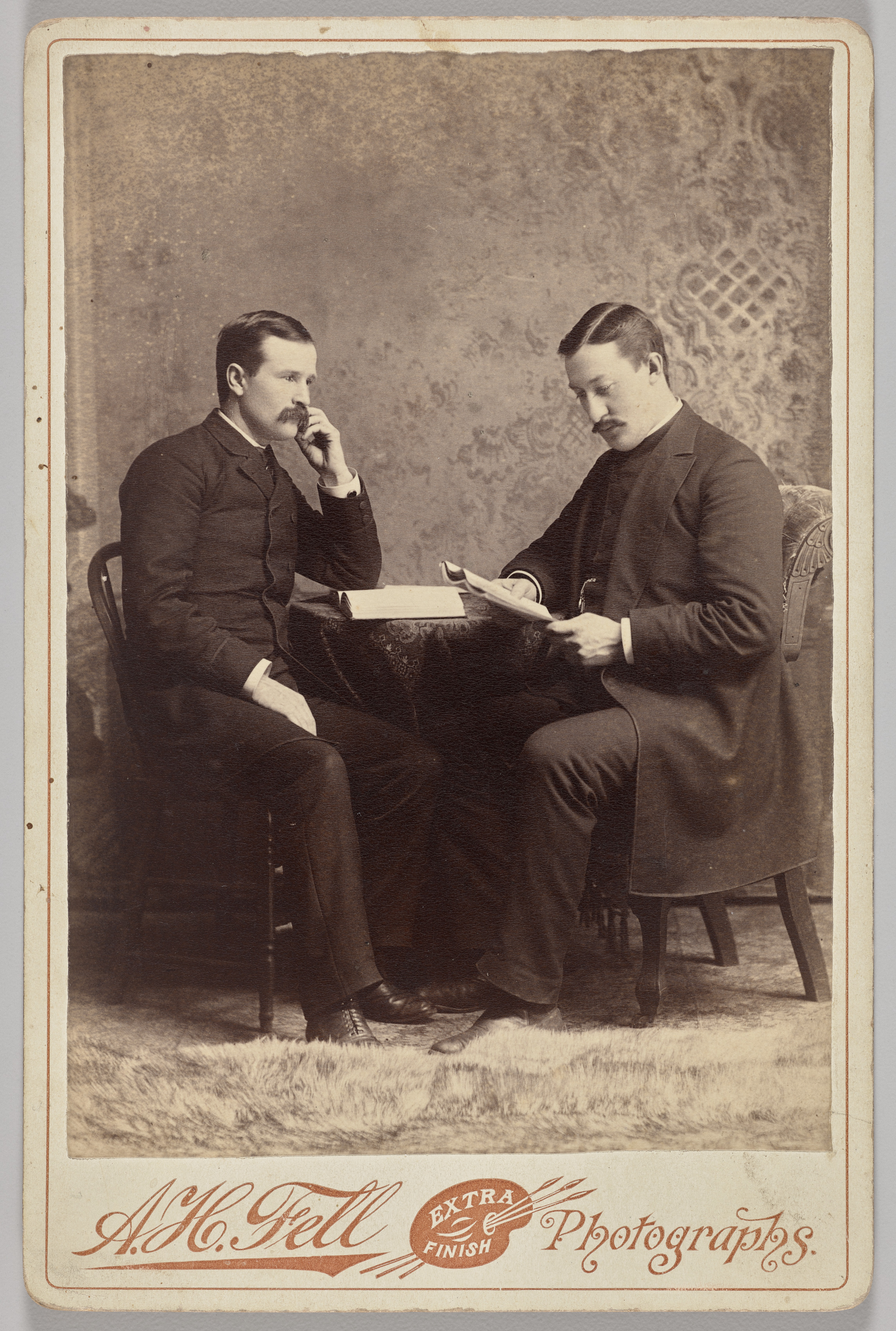 Sepia-toned photograph of two men seated. The man on the left sits with his right elbow on the table, his hand to his face and his eyes to the right. He wears a dark suit with a white shirt and dark tie. The man on the right reads a magazine, holding it with both hands. He wears a dark suit with a high collar. A table between them holds an open book. Both men sit on chairs with wooden legs. The background features a patterned wallpaper. The photograph has a textured, off-white border with red lines and text reading "A.H. Fell Photographs" and "Extra Finish".