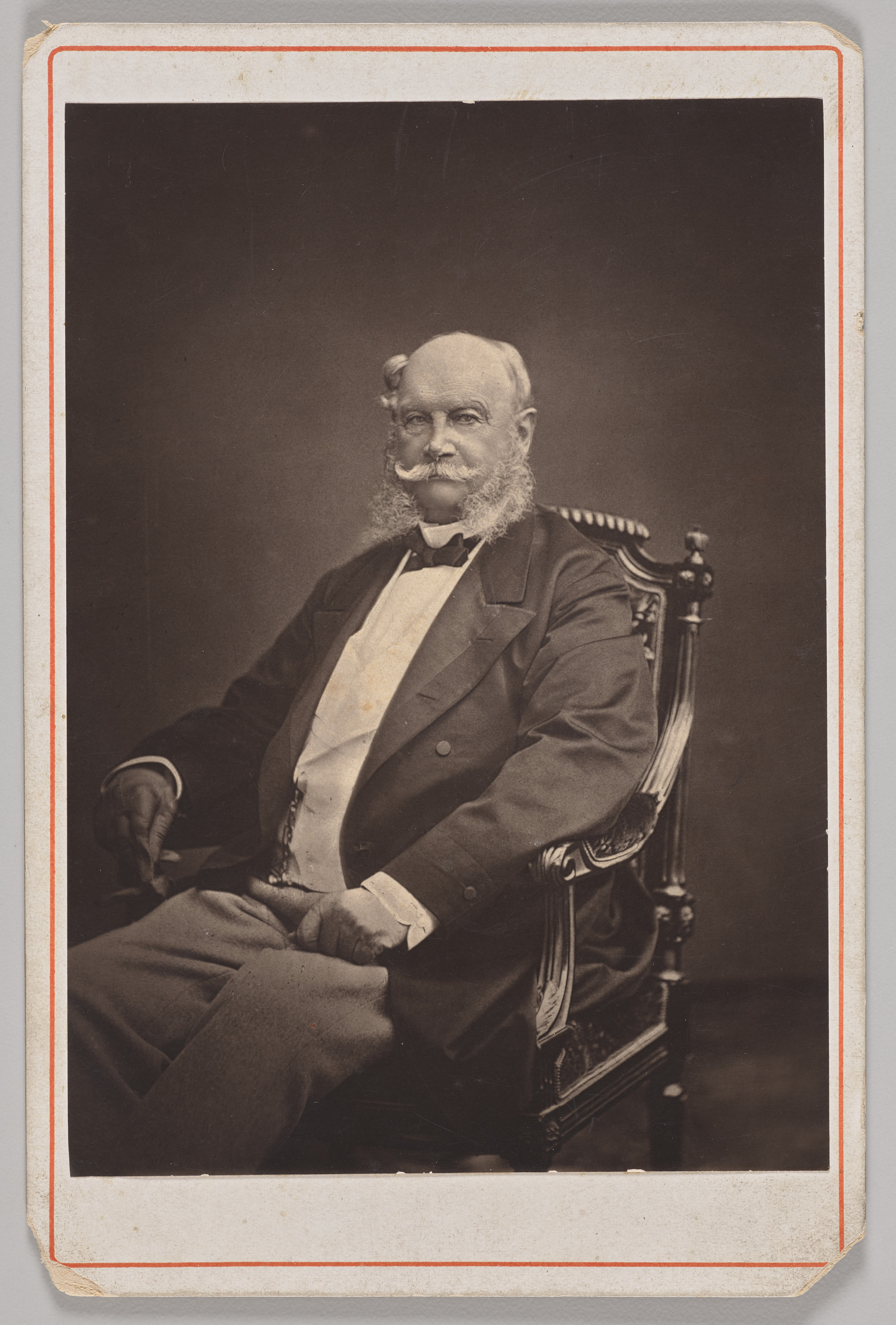 Black and white photograph of Wilhelm I, King of Prussia, seated in a chair. He is wearing a dark jacket with a white shirt and black bow tie. His hands are clasped together in his lap. He has a receding hairline and a large white beard and mustache. He is looking to the right. The chair has a high back and ornate carvings. The photograph has a white border with an orange line around the edge. The background of the photograph is dark.