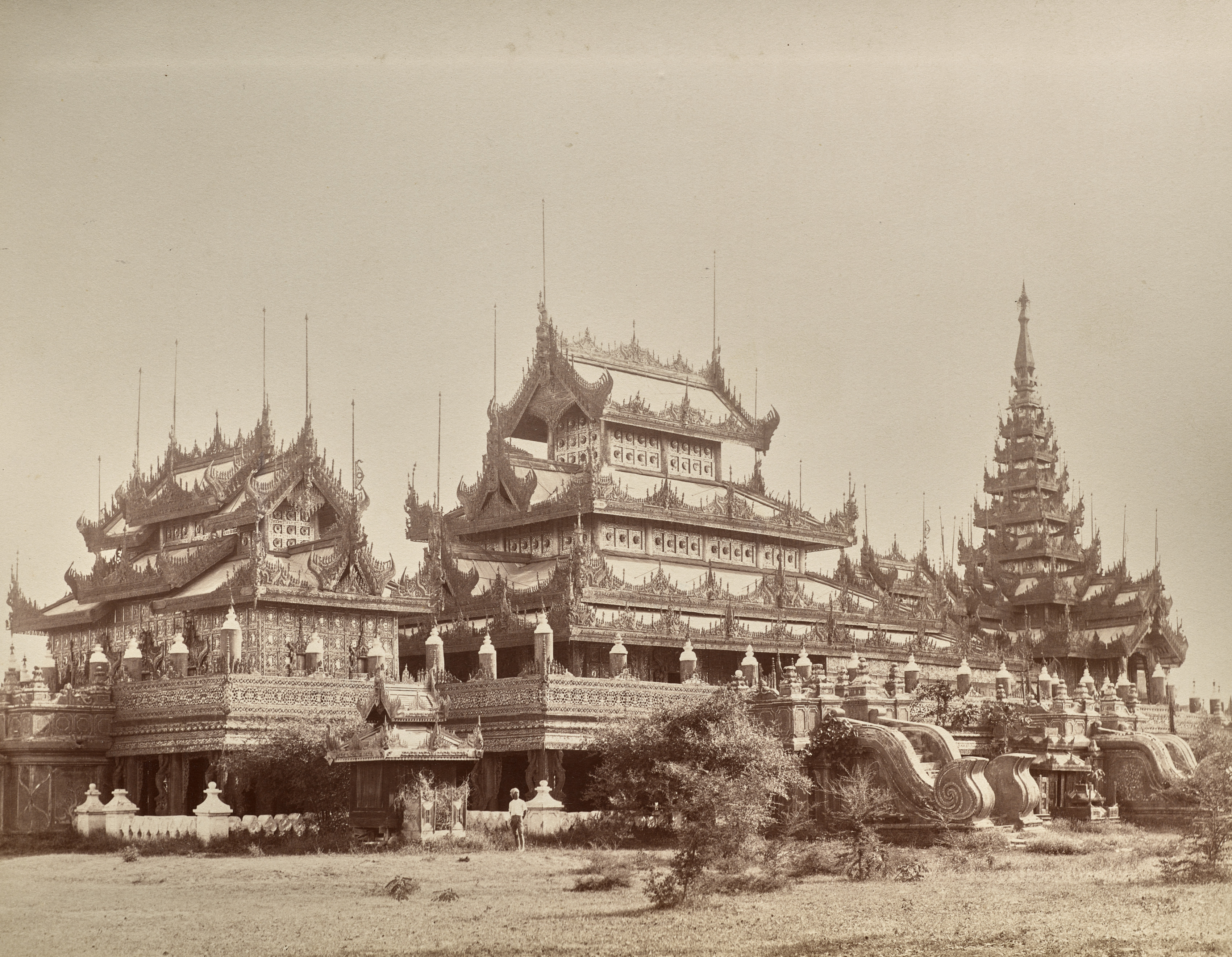 The photograph shows a large ornate building with pagoda-style roofs. The building is made of wood and features intricate carvings and ornate details. It has multiple levels, each with a slightly smaller roof. The roofs are tiled and have a curved shape, with decorative finials on top. In front of the building, there is a grassy area with some trees and bushes. To the right of the main building, there is a tall, thin tower with a similar pagoda-style roof. The photograph is in sepia tone. The artist of the image is not visually identifiable in the image.
