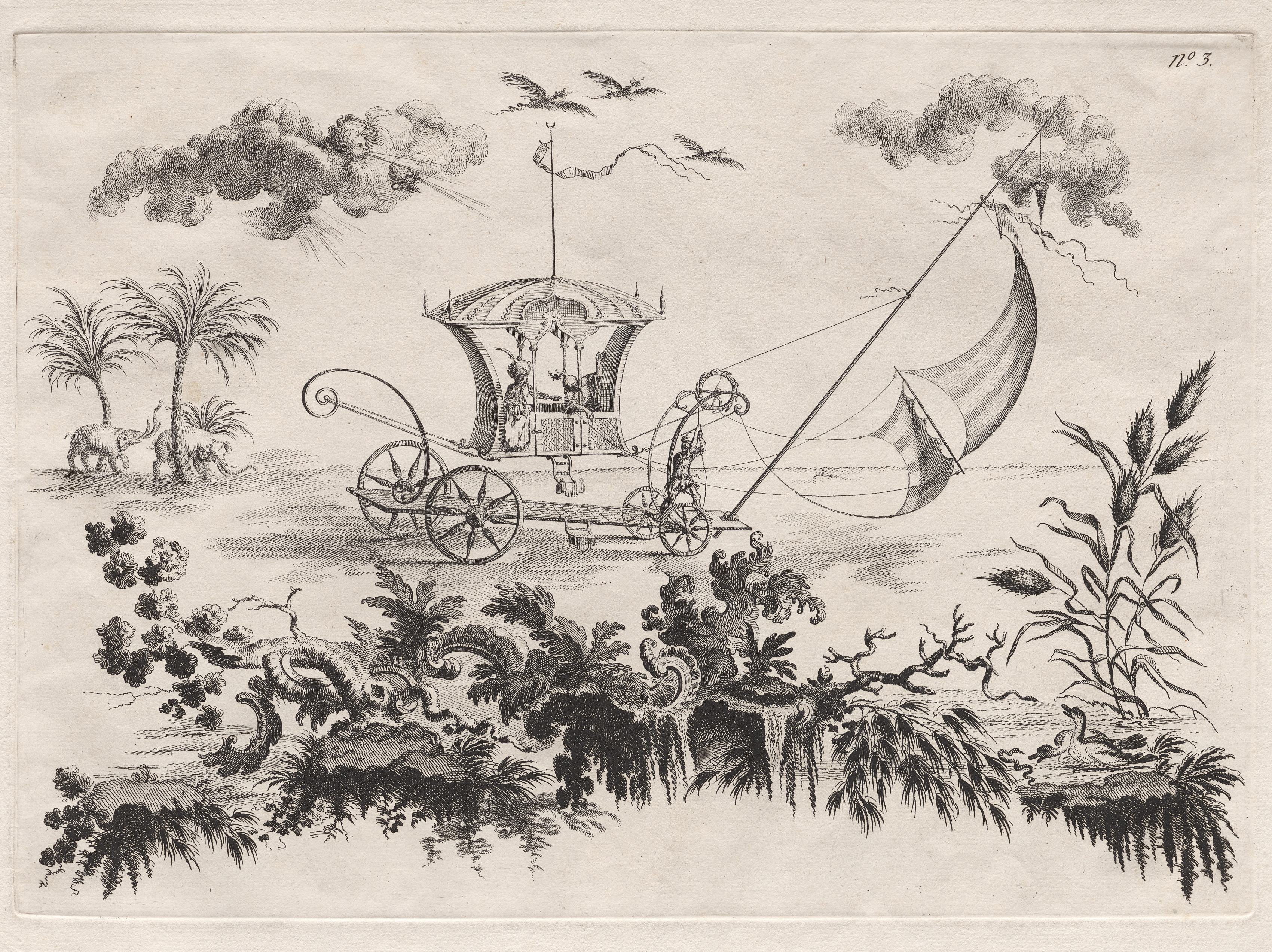 The Carriages used on the Moon and which move by sails by Filippo Morghen. Black and white drawing of a carriage on a moon surface. The carriage has large wheels and a covered compartment with two people inside. A large sail is attached to a pole on the right side of the carriage and appears to be billowing in the wind. A person sits on the right side of the carriage holding a rope attached to the sail. The carriage has a curved roof and a flag on top. The background shows a moon surface with plants and trees in the foreground, and palm trees and elephants on the left side. There are birds flying in the sky and smoke or clouds.