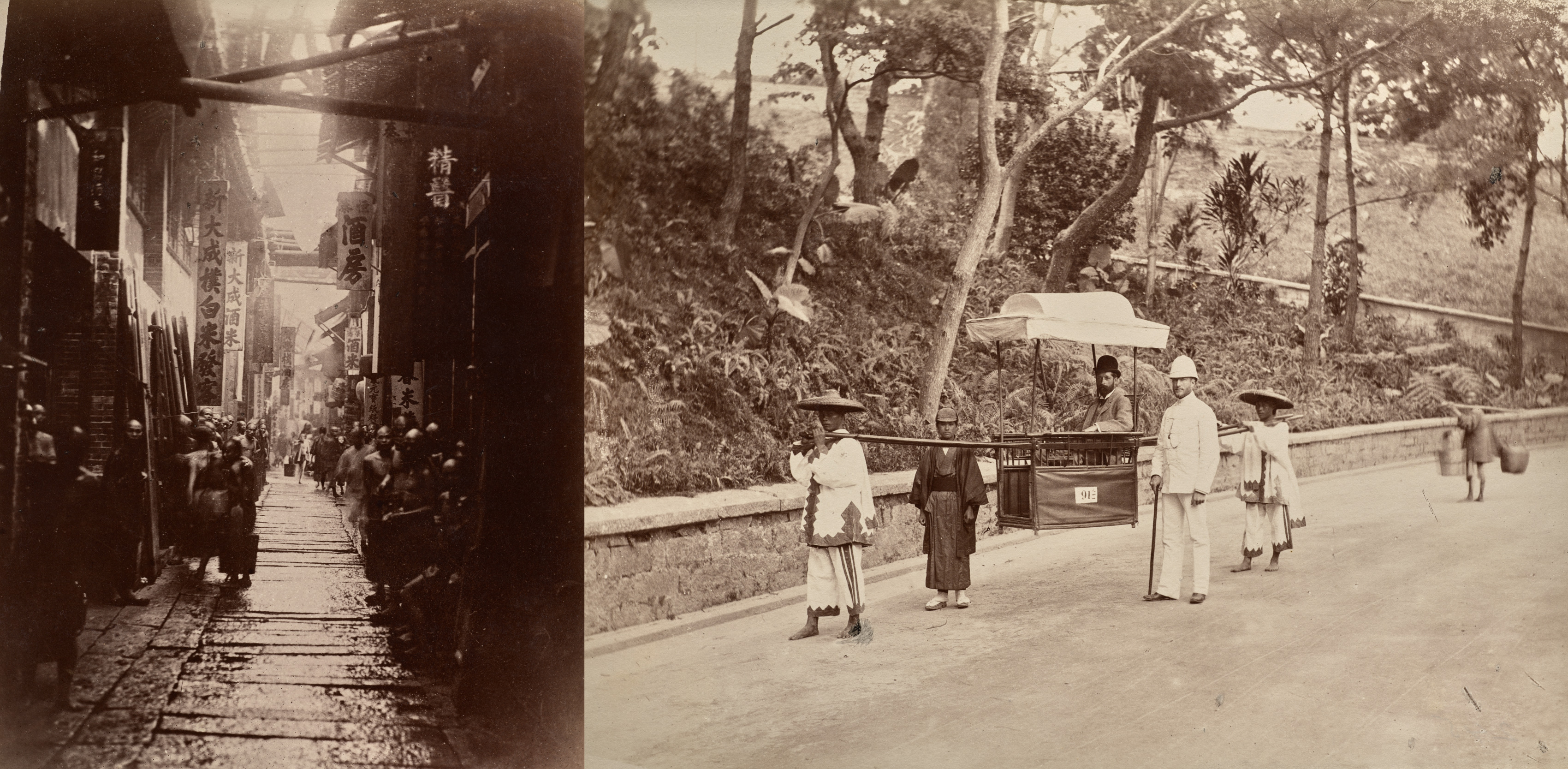 The image contains two black and white photographs. The left photograph shows a narrow alleyway with tall buildings on both sides, a crowd of people walking down the alleyway, and a brick or stone floor. The right photograph shows a road with trees and bushes on the right side and a low stone wall, four people and a covered sedan chair on the road. The people are wearing traditional clothing and hats. The background of the right photograph shows more trees and a hillside.